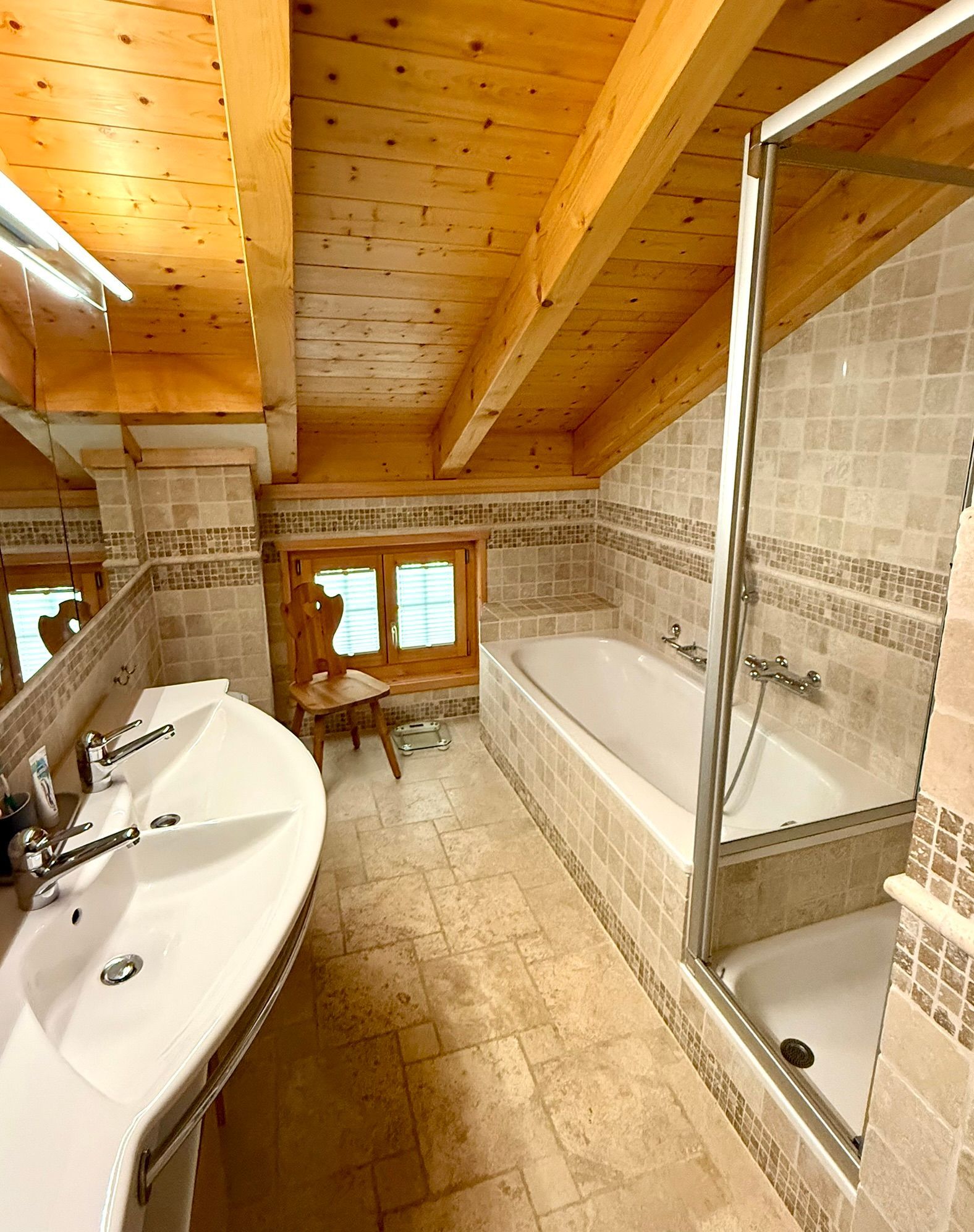 Und für die, die sich draussen den ganzen Tag aktiv bewegt haben und Abends einfach entspannen wollen, gibt es eine schöne Holzsauna im Erdgeschoss.