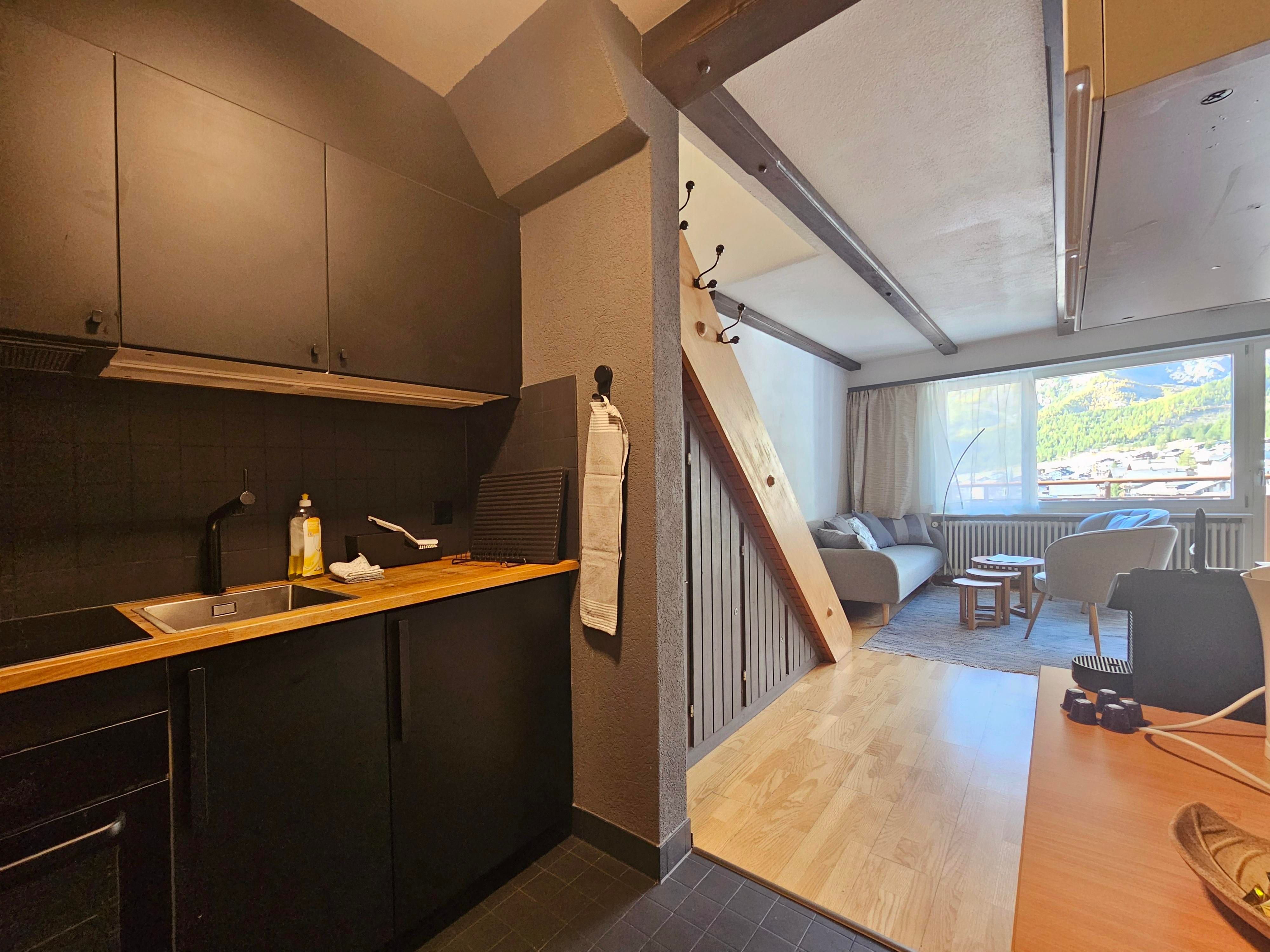 Im unteren Geschoss finden die Gäste die Küche (ohne Geschirrspüler) und den gemütlichen Ess-/Sitzbereich. Von dort aus können die Gäste zum Highlight der Wohnung, dem nach Süden ausgerichteten Balkon, gelangen. Das grössere Badezimmer mit Dusche, Waschbecken & Toilette befindet sich ebenfalls in diesem Geschoss.
