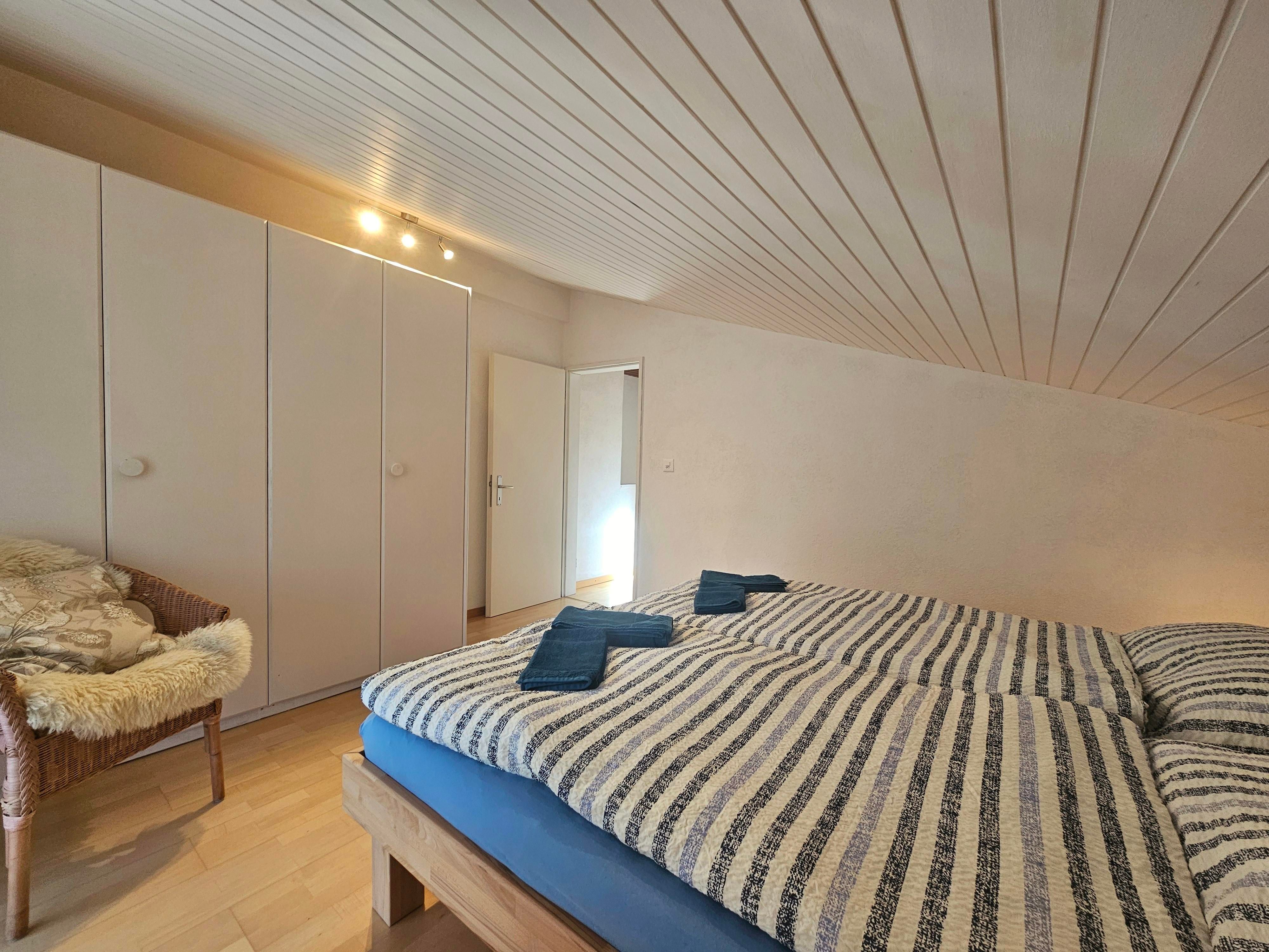 Die Wohnung verfügt über 3 Schlafzimmer für maximal 5 Gäste. Es gibt 2 Schlafzimmer mit je einem Doppelbett sowie ein Einzelzimmer. Alle Schlafzimmer befinden sich im Obergeschoss. Ebenfalls im Obergeschoss befindet sich ein neu renoviertes Badezimmer mit Toilette, Dusche & Waschbecken.