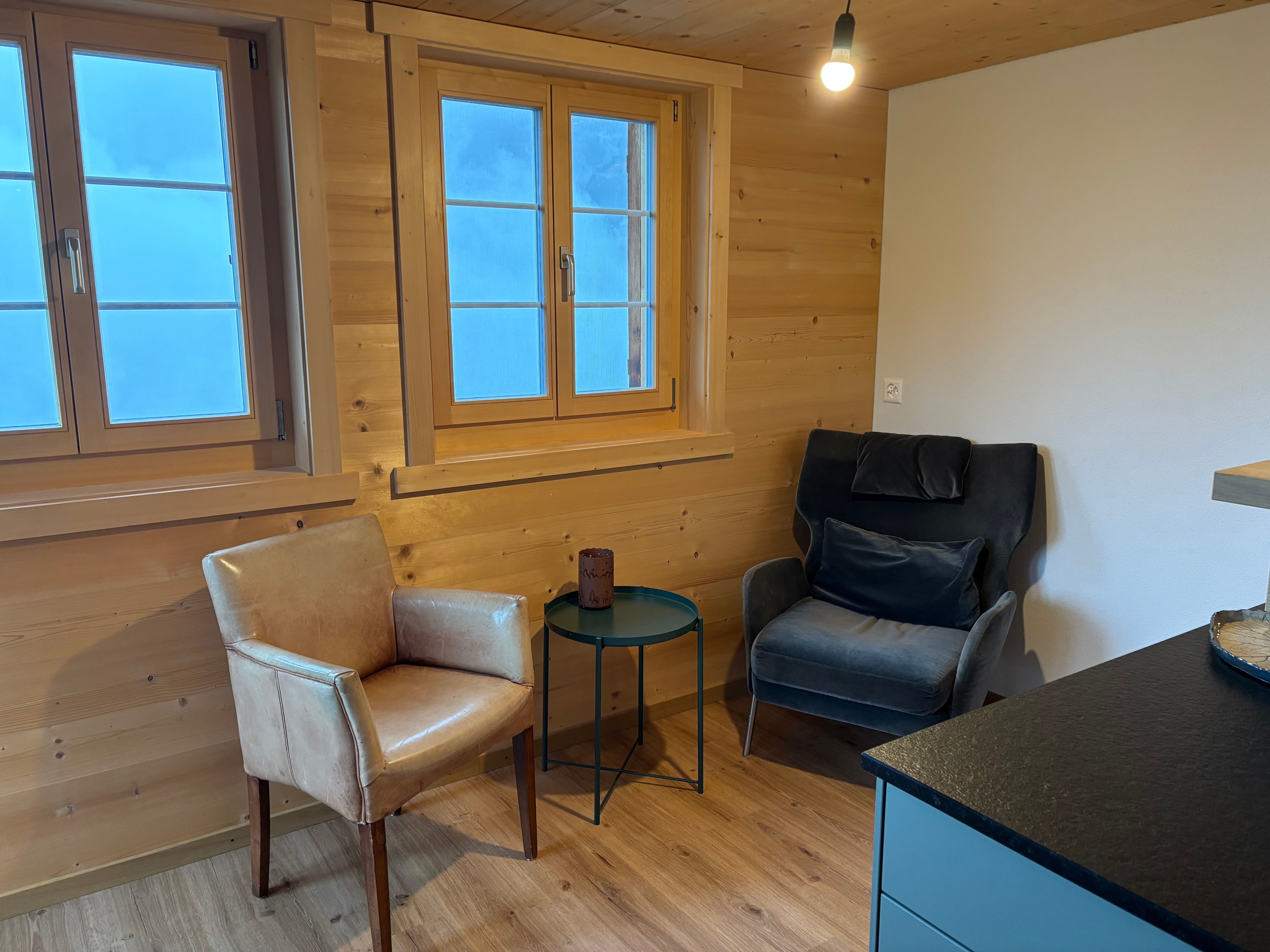 Die Innenausstattung des Waldweidli bietet alles, was das Herz begehrt. Im gemütlich eingerichteten Wohnbereich finden sich ein Fernseher, diverse Gesellschaftsspiele und Bücher, die zu unterhaltsamen Abenden einladen. Eine voll ausgestattete Küche mit gemütlicher Esstischecke lässt keine Wünsche offen. Das Schlafzimmer mit einem 180 cm x 200 cm großen Doppelbett und einem Schlafsofa sowie ein Badezimmer mit WC und Dusche runden das Wohlfühlambiente ab. Eine Kaffeemaschine mit Delizio-System steht bereit (Kaffeekapseln bitte selbst mitbringen), und eine Garderobe bietet genügend Platz für Schuhe und Jacken.