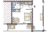 großzügies Wohn- Schlafzimmer mit Doppelbett