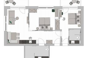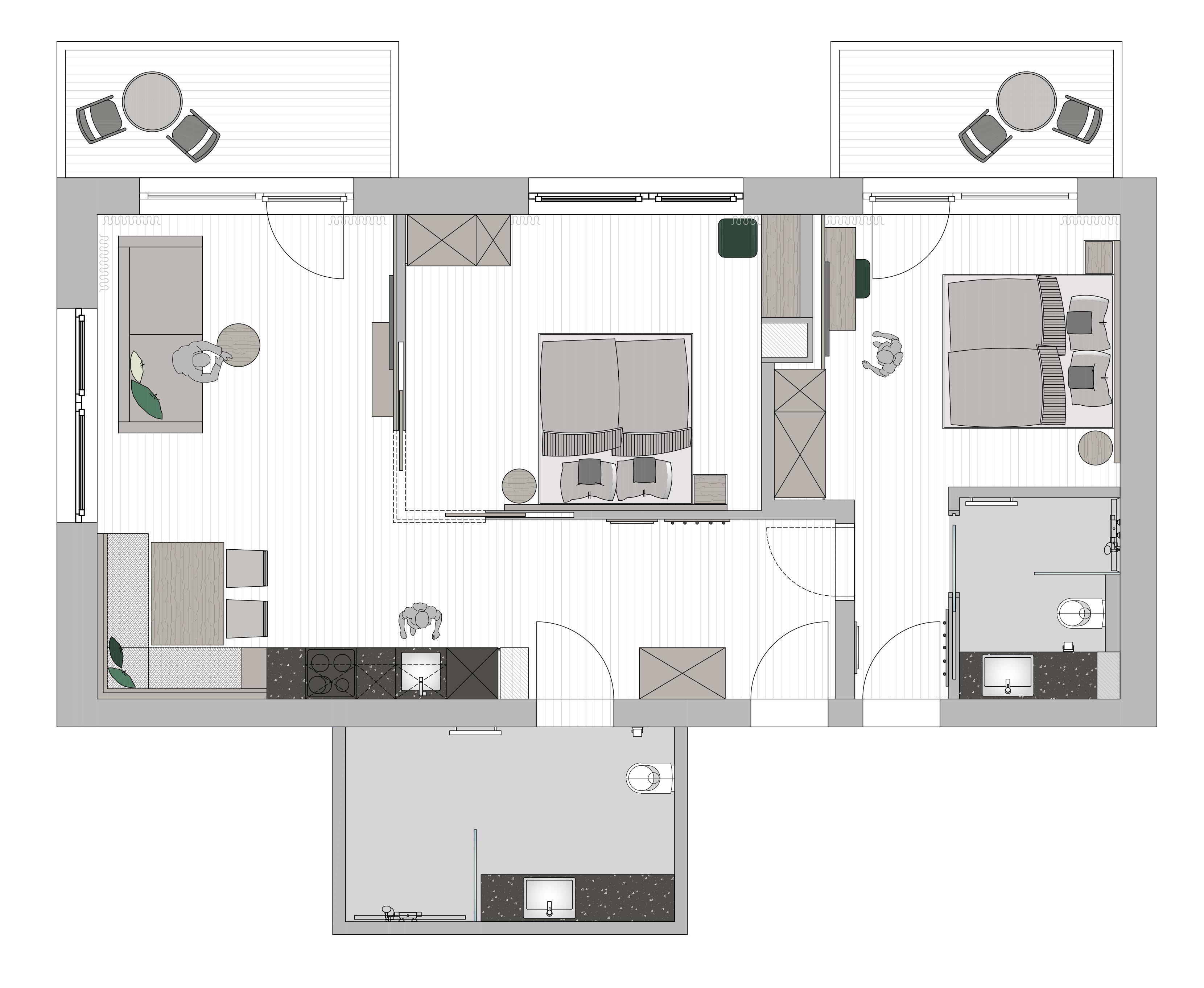 Unser 75 m² Apartment deLuxe bietet Raum für bis zu 6 Personen und alles, was du für eine entspannteAus.Zeit brauchst: eine voll ausgestattete Küche mit Essecke, ein einladender Wohnbereich mit Sofa und Kabel-TV für entspannte Abende sowie 2 Balkone um die Nachmittagssonne zu genießen.