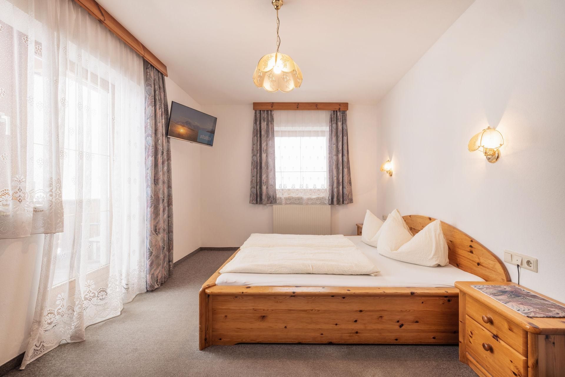 Unser gemütliches Doppelzimmer mit einem Balkon und herrlichen Blick auf die Stubaier Bergwelt bietet eine komfortable Ausstattung. Zur Ausstattung gehört ein Doppelbett, Badezimmer mit Fenster, kostenfreies WLAN, und TV.