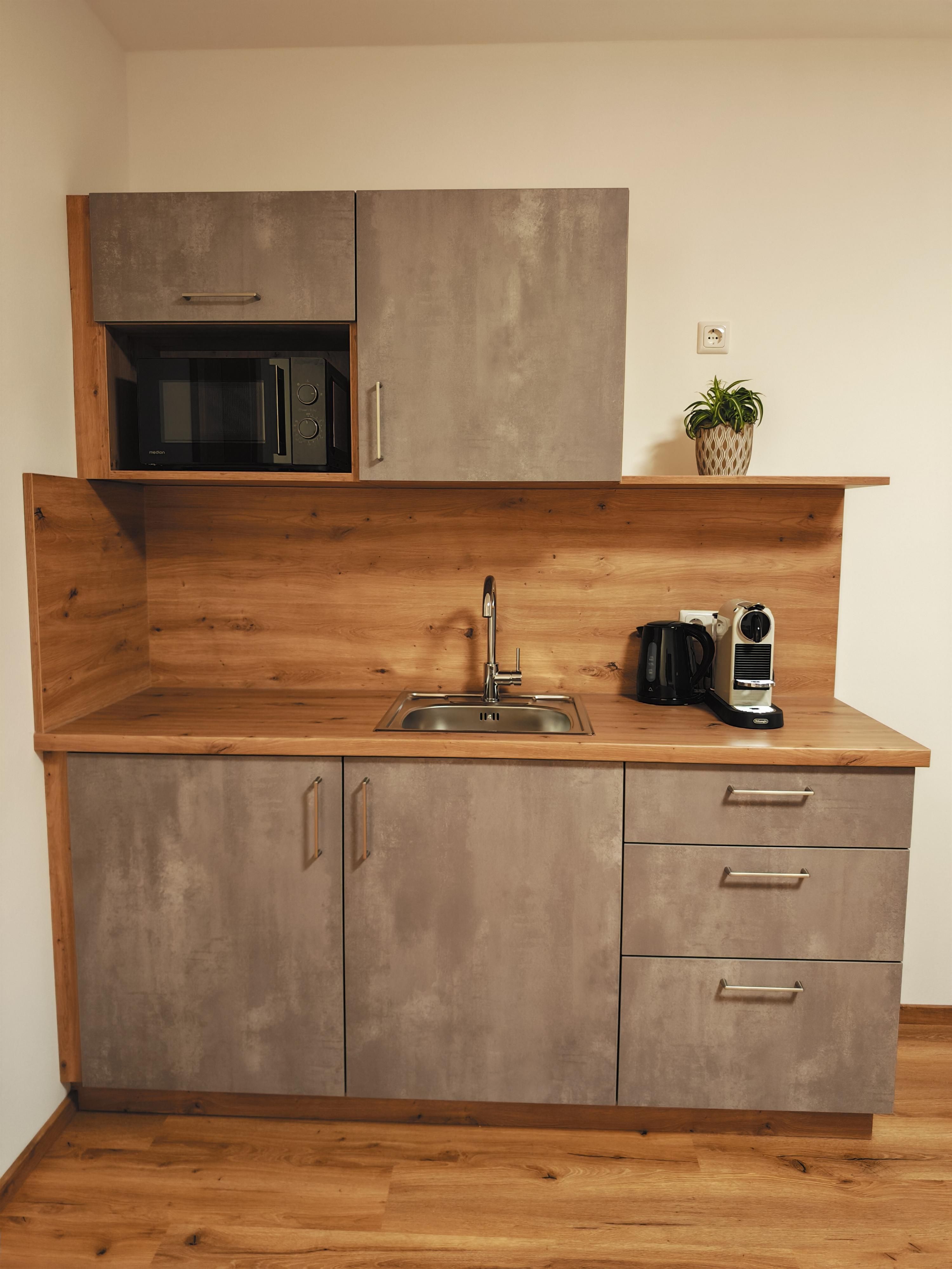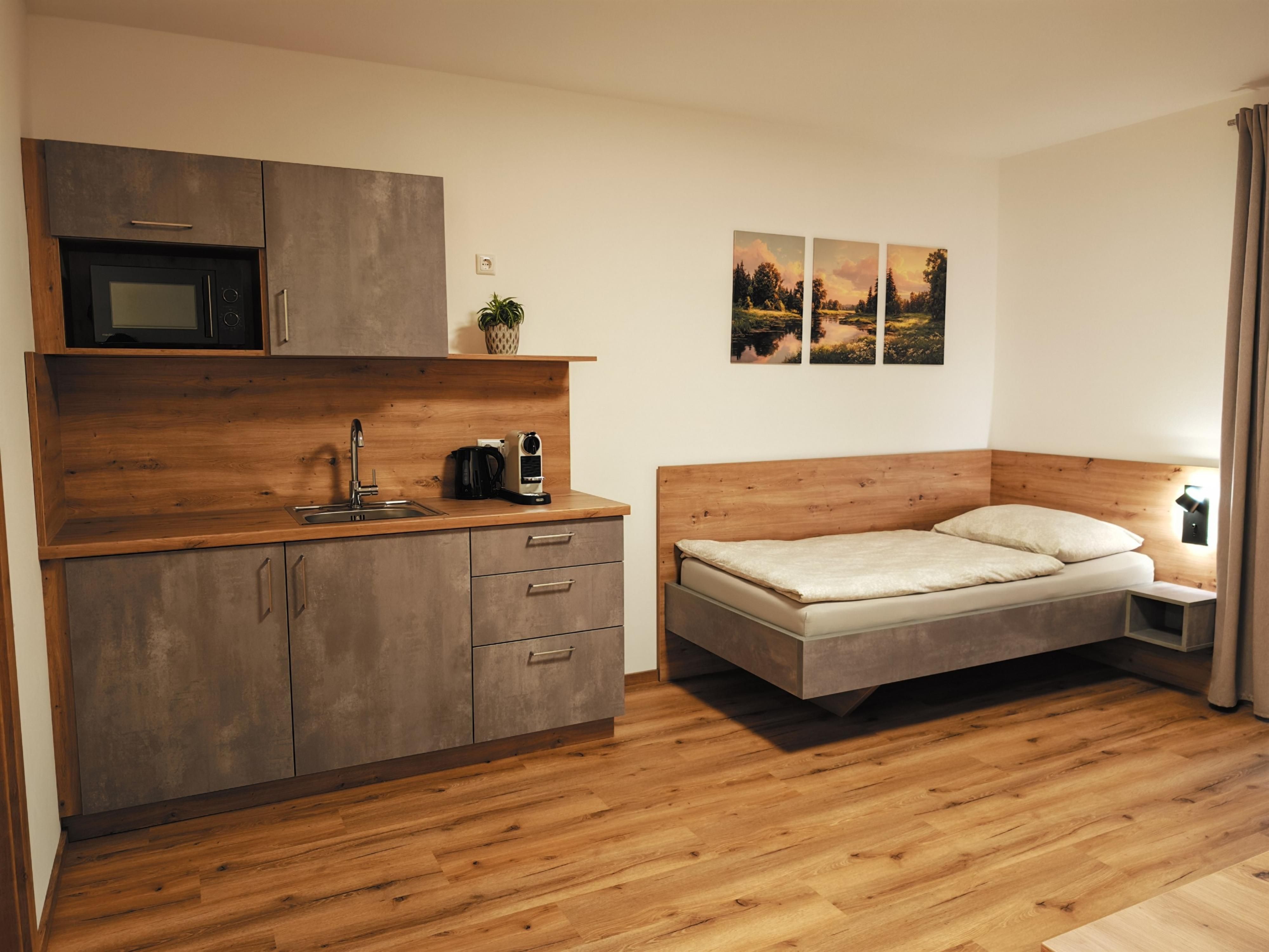Genießen Sie den Komfort und Stil unseres brandneuen Gästezimmers mit hochwertiger Tischler-Einrichtung. Die hellen, lichtdurchfluteten Räume bieten zwei getrennte Einzelbetten (extralang: 100×200cm) für optimalen Schlaf. Die voll ausgestattete Kochnische lässt keine Wünsche offen: Sie beinhaltet Backofen, Kochplatte, Mikrowelle, Kühlschrank sowie eine Kaffee-Espressomaschine und Teekocher. Zur weiteren Ausstattung gehören ein modernes Bad (Dusche/WC/Fön), kostenloses WLAN, SAT-TV und eine separate Rauchgelegenheit.