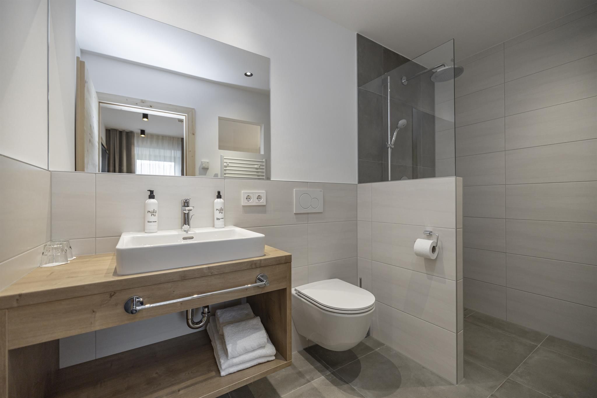 • Badezimmer mit Regendusche und WC, Haarföhn und im Winter Fußbodenheizung, teilweise mit Handtuchtrockner