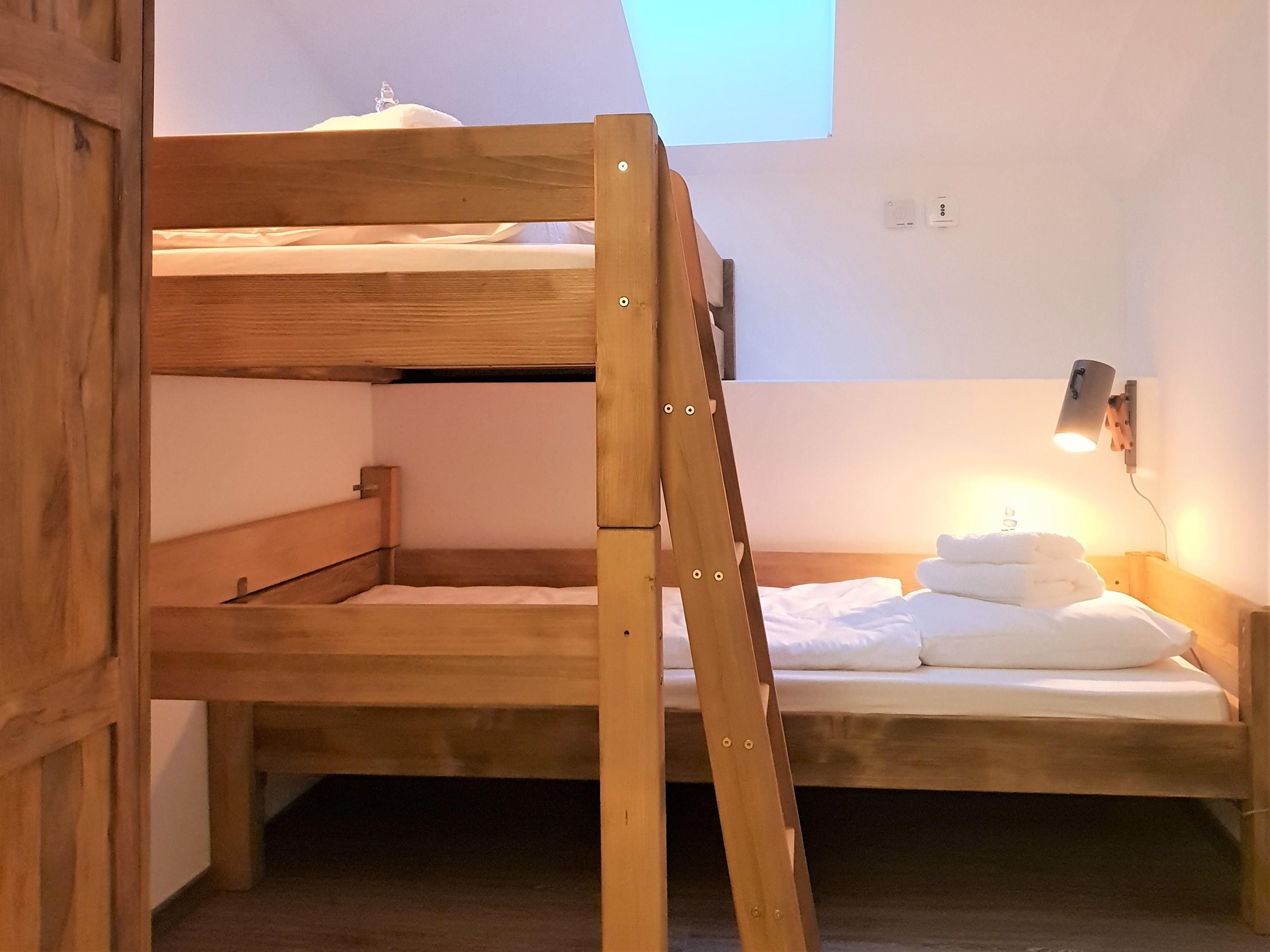 Die frisch renovierte Ferienwohnung Birke bietet Platz für bis zu vier Gäste. Sie verfügt über zwei Schlafzimmer: Ein gemütliches Zimmer mit einem großzügigen Doppelbett, das auf Wunsch auch in zwei Einzelbetten umgewandelt werden kann, und ein weiteres Schlafzimmer mit einem Etagenbett, das Platz für zwei weitere Gäste bietet. Das Etagenbett ist mit einer Länge von 2 Metern auch für Erwachsene geeignet.