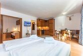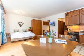 Die Ferienwohnung Tanne bietet Platz für bis zu 4 Personen und ist im Studio-Stil gestaltet. Das Wohnzimmer verfügt über ein großzügiges Doppelbett, das auf Wunsch in zwei separate Betten umgewandelt werden kann. Zudem gibt es zwei Einzelbetten in einer separaten Nische. Eine voll ausgestattete Küche, ein großer Esstisch und ein Badezimmer mit Badewanne runden das Angebot ab.