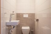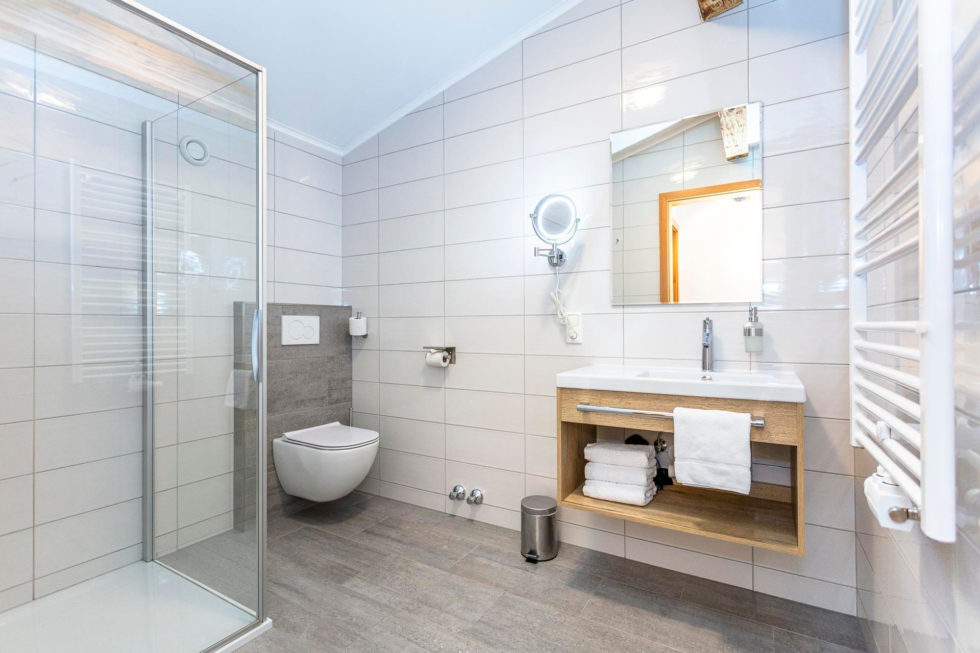 Der Wohnbereich ist mit einem (Schlaf-)Sofa ausgestattet und geht nahtlos in die moderne Küche sowie den Essbereich über. Das Badezimmer verfügt über eine Regendusche und eine Toilette, zusätzlich gibt es eine separate Gästetoilette.