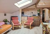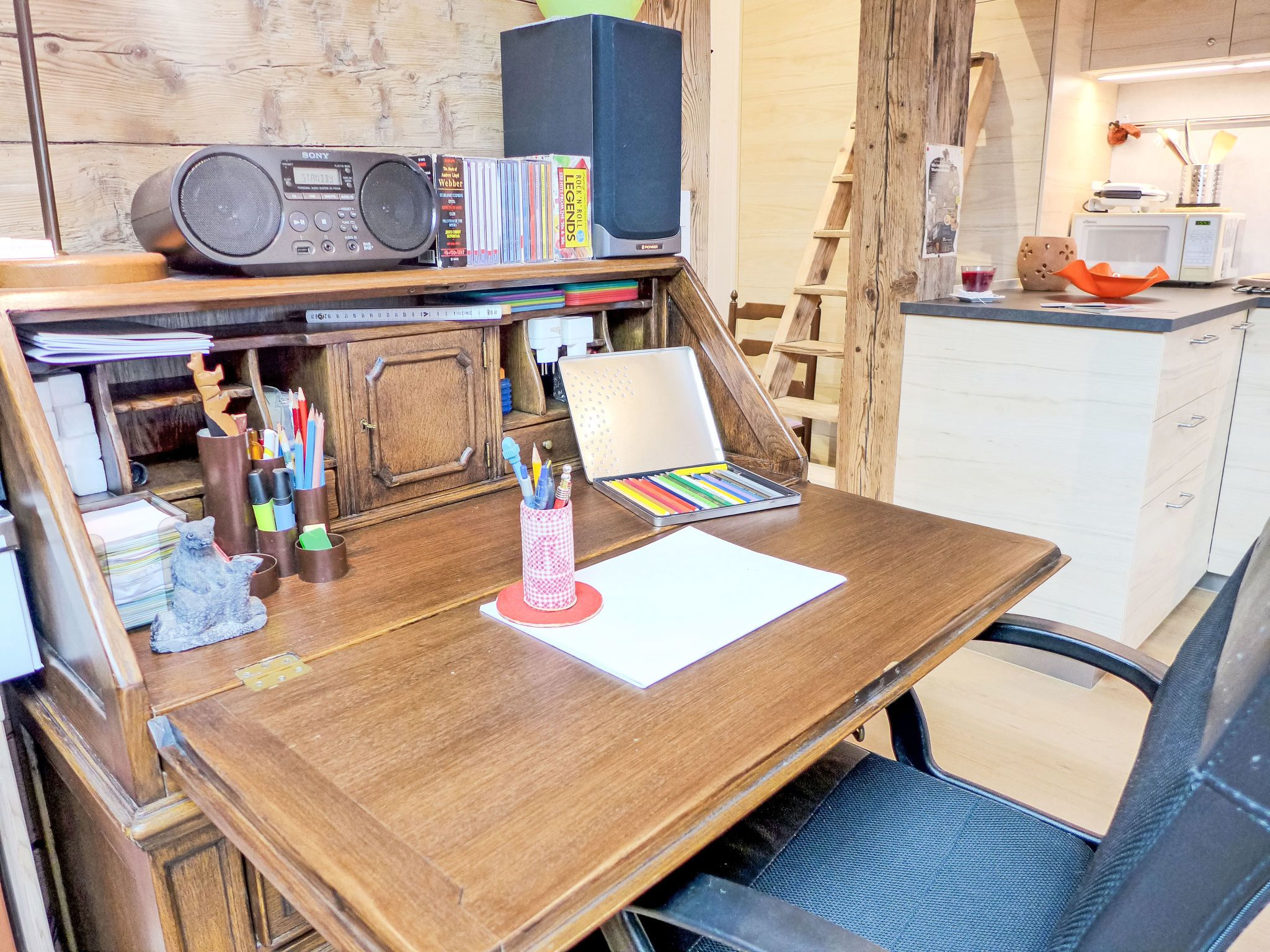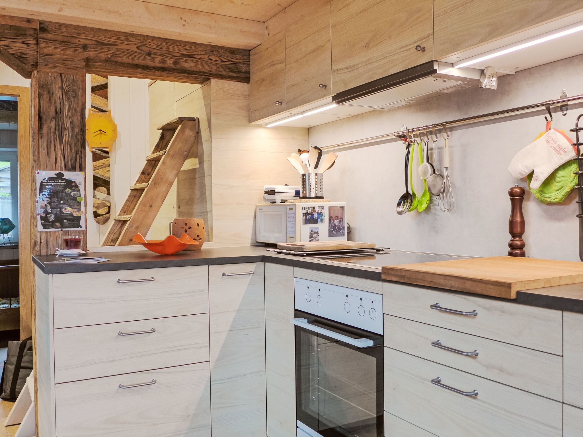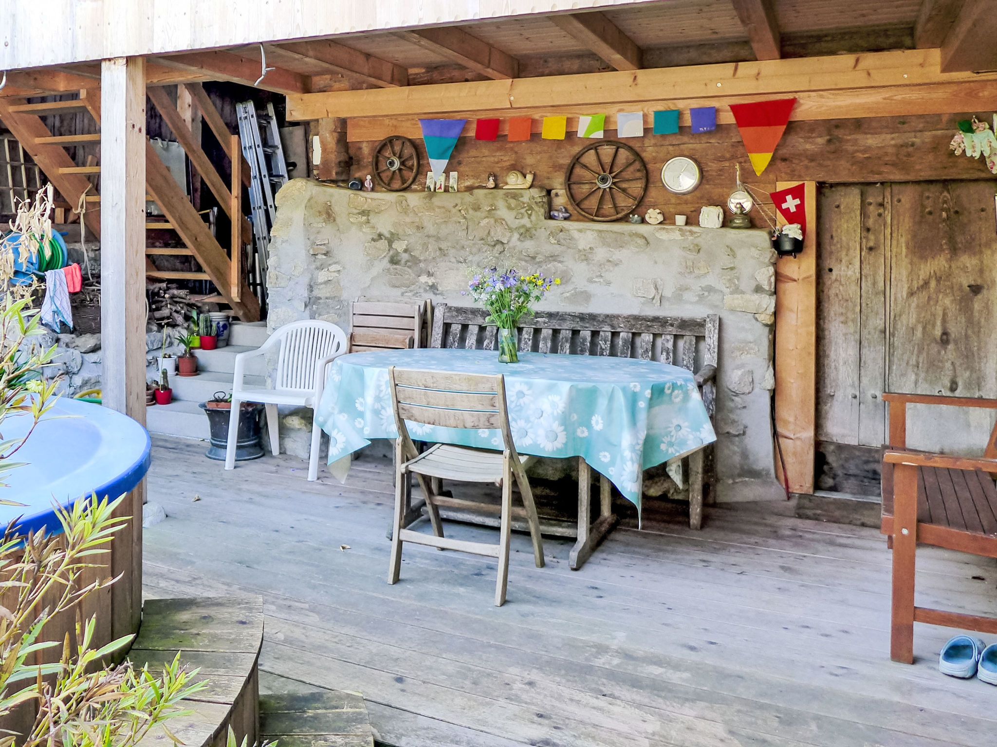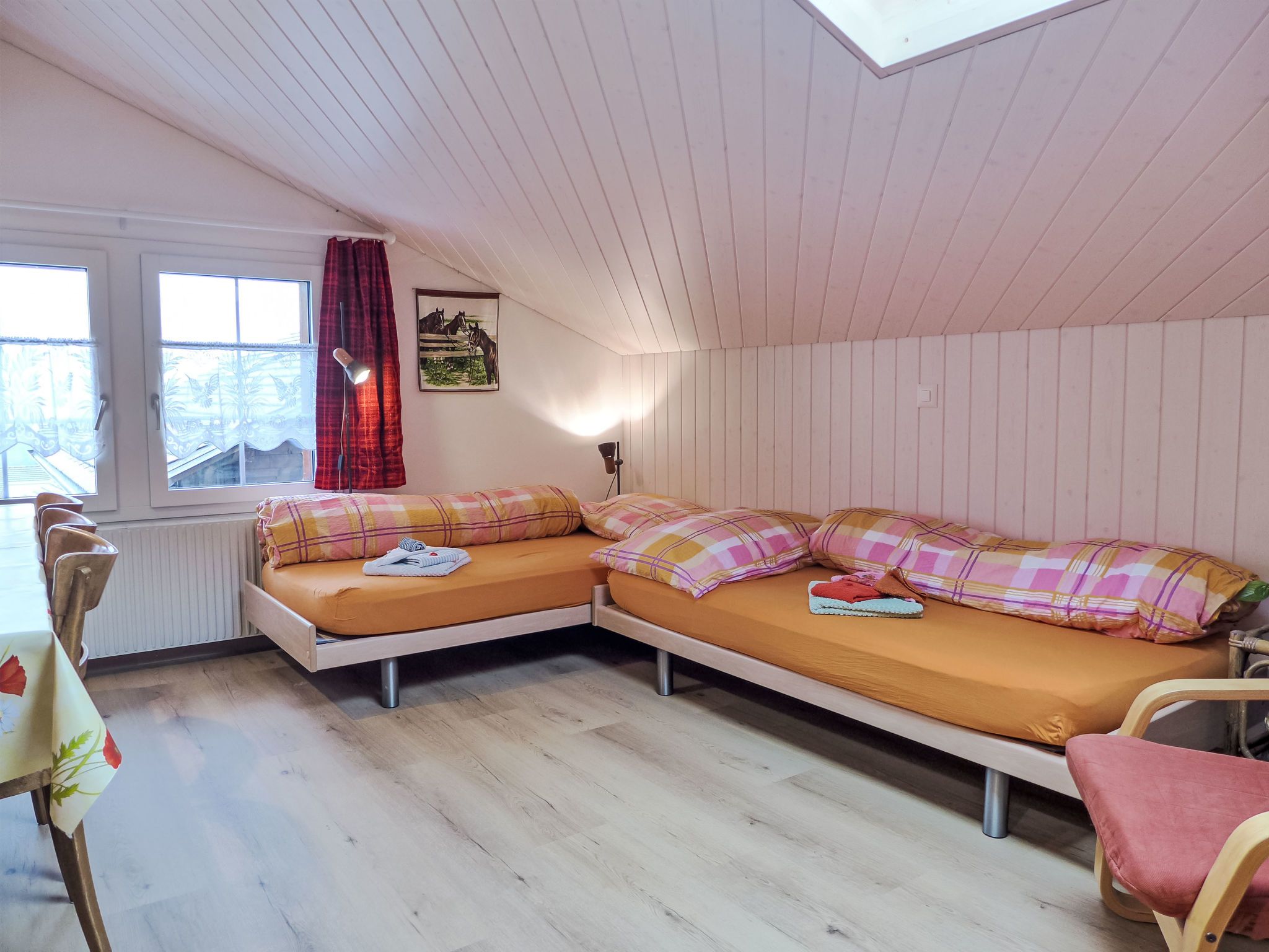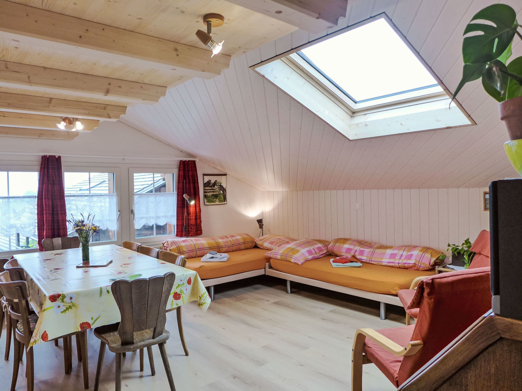 Beim Thor Gross, 3-Zimmer-Wohnung 50 m2 auf 2 Stockwerken, im Obergeschoss. Geräumig und hell, teilweise abgeschrägt, einfach und gemütlich eingerichtet: offenes grosses Wohn-/Schlafzimmer mit 2 Betten (90 cm, Länge 200 cm), Esstisch, Flachbildschirm, Radio, Stereoanlage und DVD. 1 Zimmer mit 1 x 2 Etagenbetten (90 cm, Länge 200 cm). Offene Küche (Backofen, Geschirrspüler, 3 Glaskeramikplatten, Toaster, Wasserkocher, Mikrowelle, elektrische Kaffeemaschine, Kapseln für die Kaffeemaschine (Delizio) extra, Racletteofen, Fondue Set (Käse)). Dusche/WC. Dachgeschoss: (Leiter) 1 abgeschrägtes Zimmer mit 3 Schlafmöglichkeiten (90 cm, Länge 200 cm). Kleine Terrasse. Balkonmöbel. Schöne Sicht auf die Berge und die Landschaft. Zur Verfügung: Babybett bis 2 Jahre (extra), Haartrockner. Internet (WLAN, gratis). Parkplatz (1 Auto). Bitte beachten: Nichtraucher-Unterkunft. Maximal 1 Haustier/Hund erlaubt.