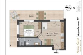 1 Doppelzimmer, eine Wohnküche mit Essecke/ Sofa=Doppel-Ausziehbett/ gut ausgestatteter Küchenzeile, Sat-TV, Dusche/ WC und großem Sonnenbalkon.
