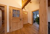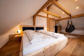 Charaktervolle Holzelemente schaffen eine warme Atmosphäre: Das Zirbendoppelbett sorgt für erholsamen Schlaf, und der handgefertigte Eichen-Esstisch lädt zu geselligen Momenten ein. Im Badezimmer setzt eine restaurierte Werkbank aus dem Jahr 1920 mit modernen Steinbecken einen besonderen Akzent.