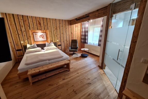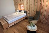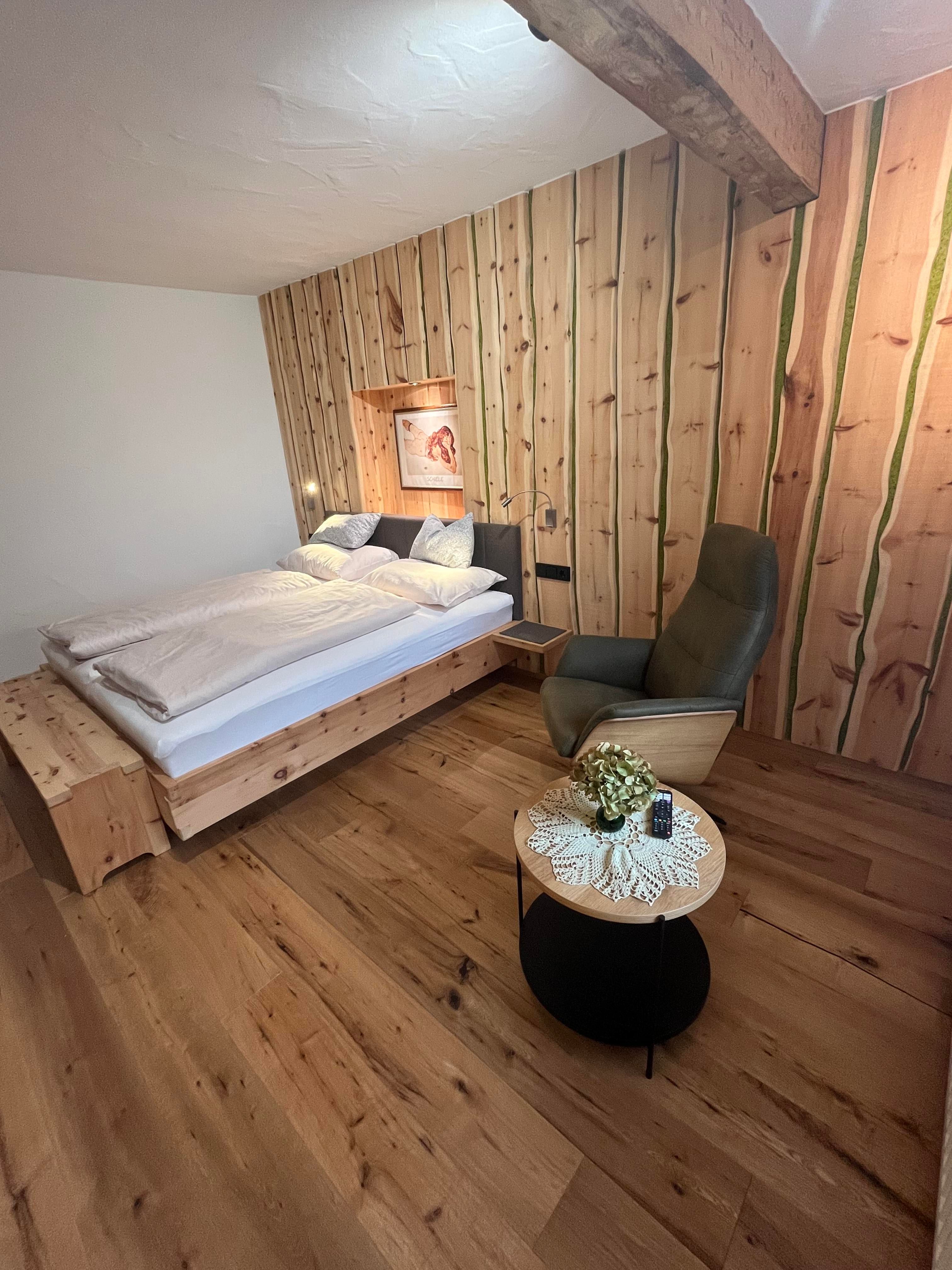 Neues, gemütliches Doppelbett-Zimmer aus heimischen Zirbenholz - zentralgeheizt, schönes Bad mit Dusche und WC;