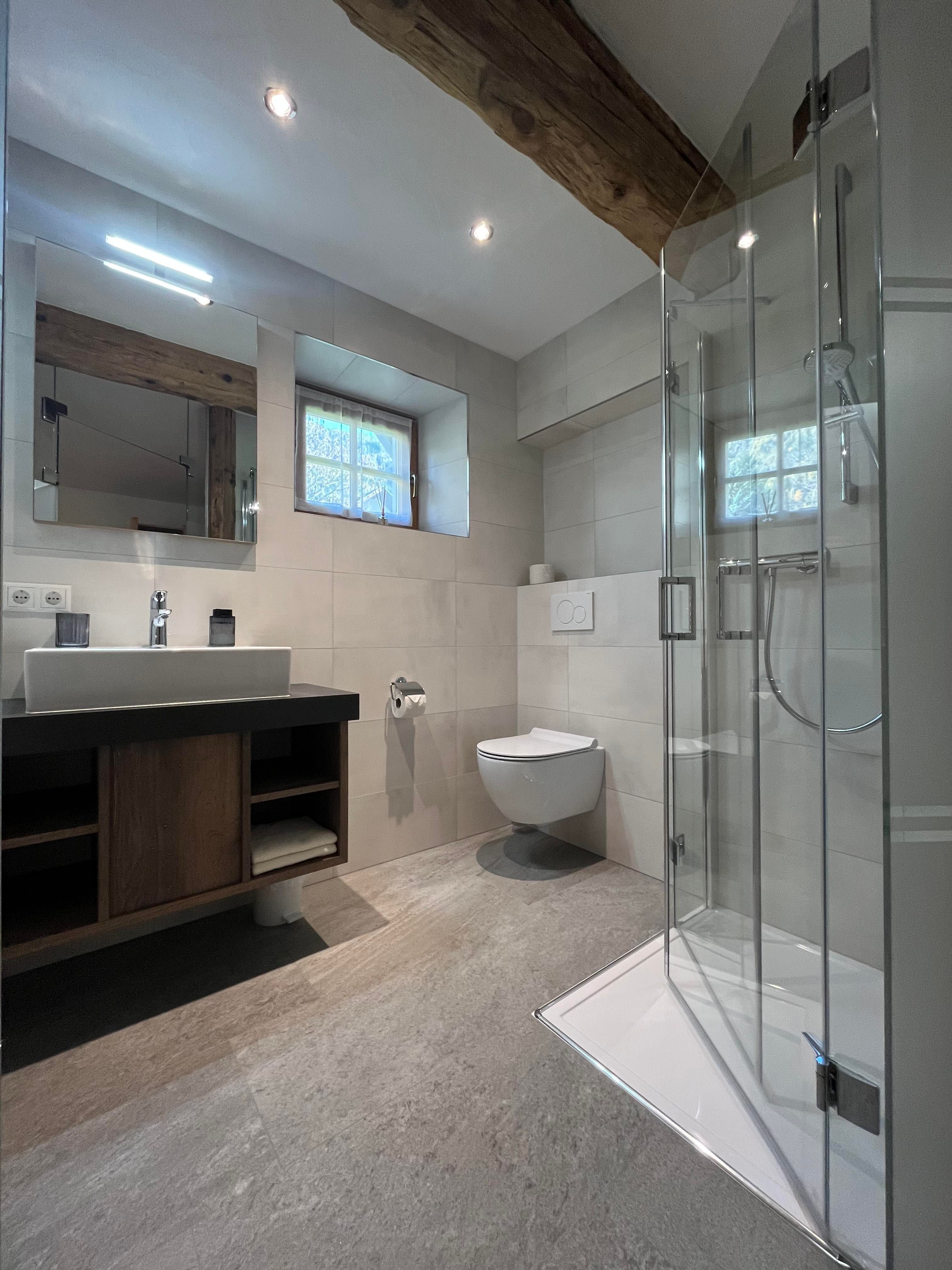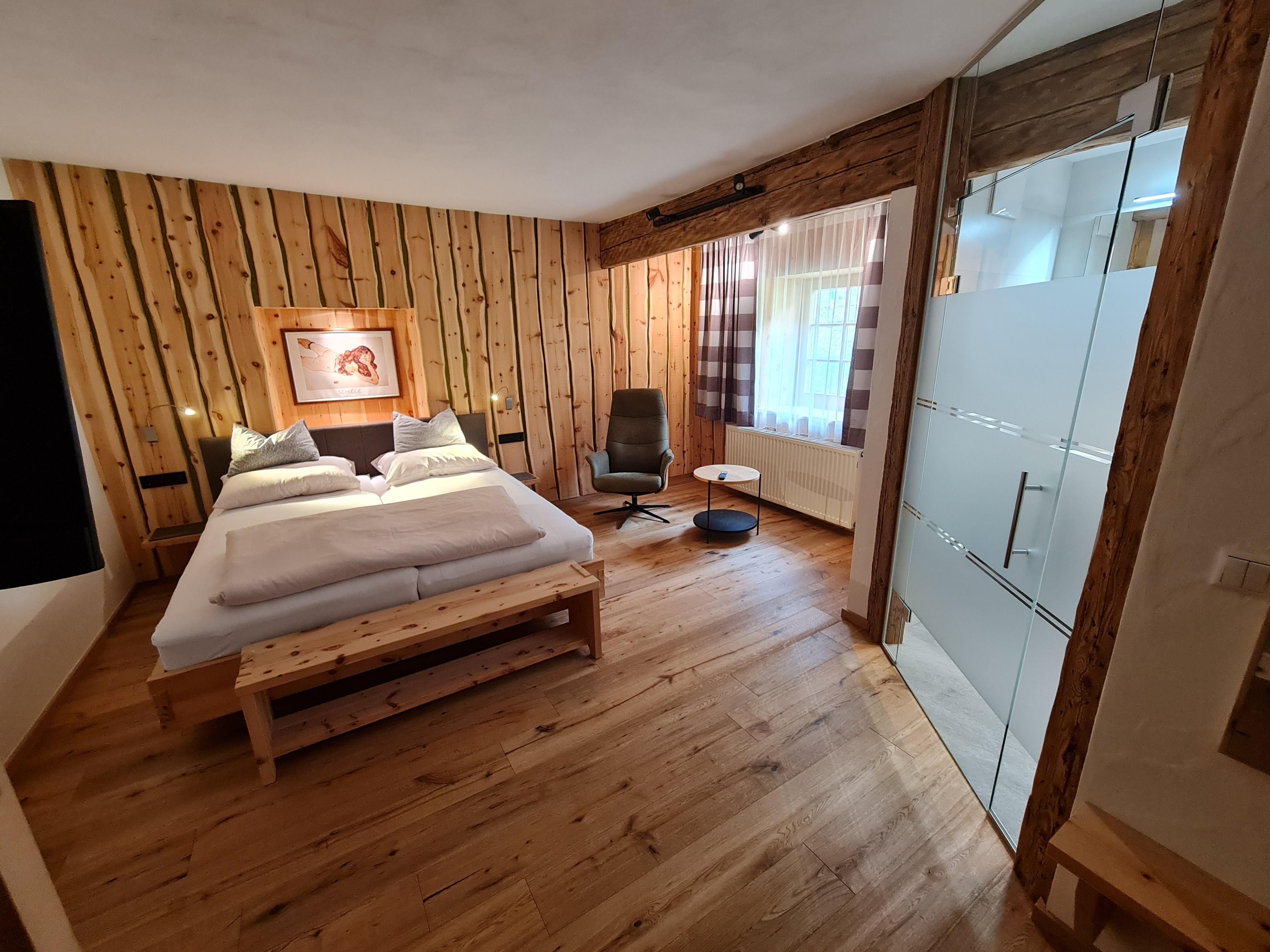Zu den beiden Apartments können wir nun auch zwei neue, schöne Komfortzimmer mit jeweils einem Doppelbett, Bad und WC im ersten Obergeschoss unseres Bauernhauses anbieten.