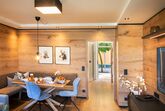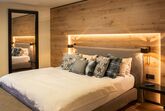 Gemütliche Holzvertäfelung kombiniert mit modernen Einbaumöbeln in warmen Holztönen, vereinen Tradition und Design. Die ebenso in höchster Handwerkskunst gefertigten Boxspringbetten der Fa. Treca Paris versprechen erholsamen Schlaf und Energie für Ihre Urlaubsaktivitäten rund um das ländliche Bad.