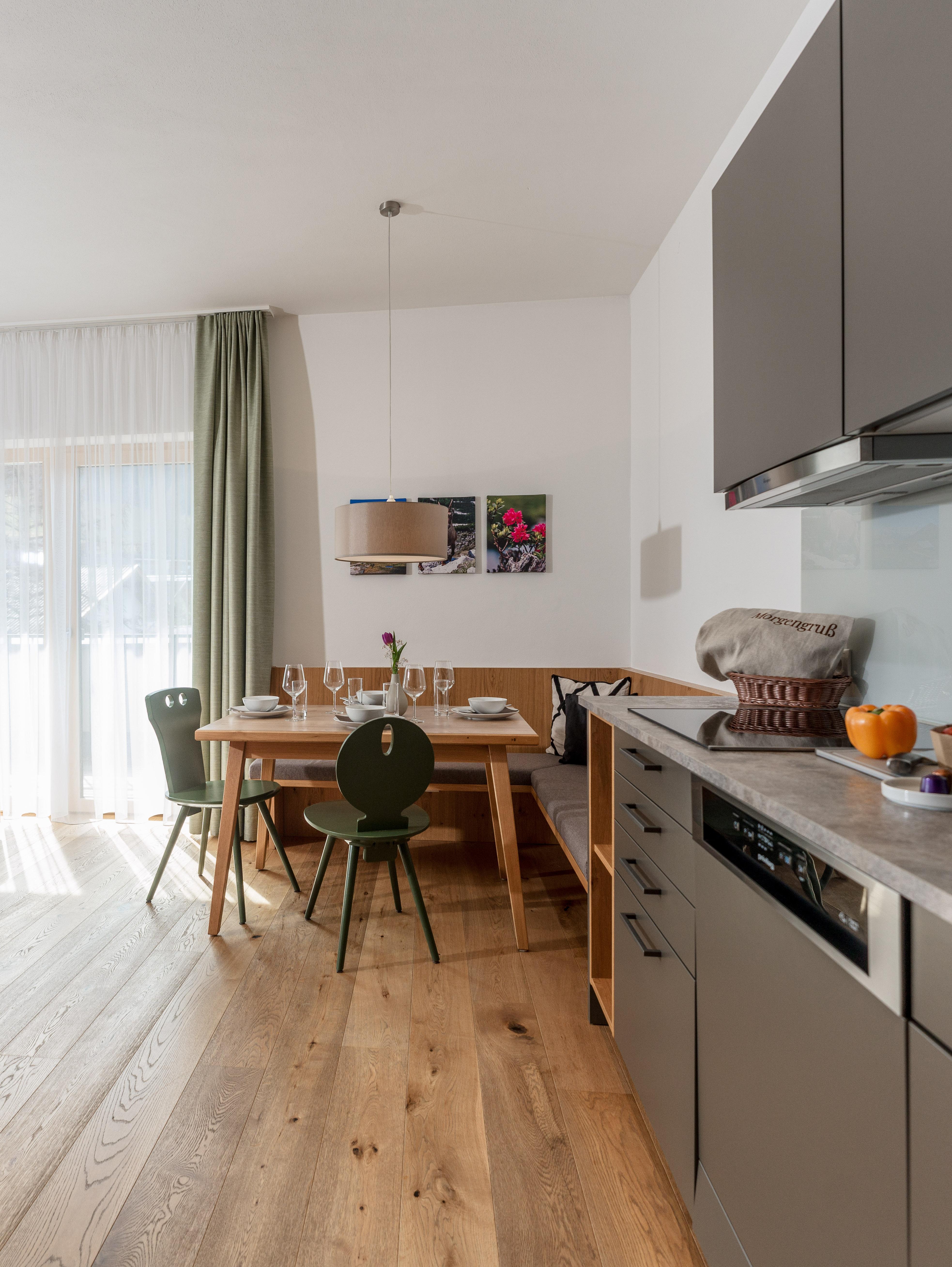 Jedes Apartment bietet eine voll ausgestattete Küche mit Essecke, einen Wohnbereich mit Kabel-TV und zwei Balkone für frische Bergluft und Ausblick.