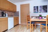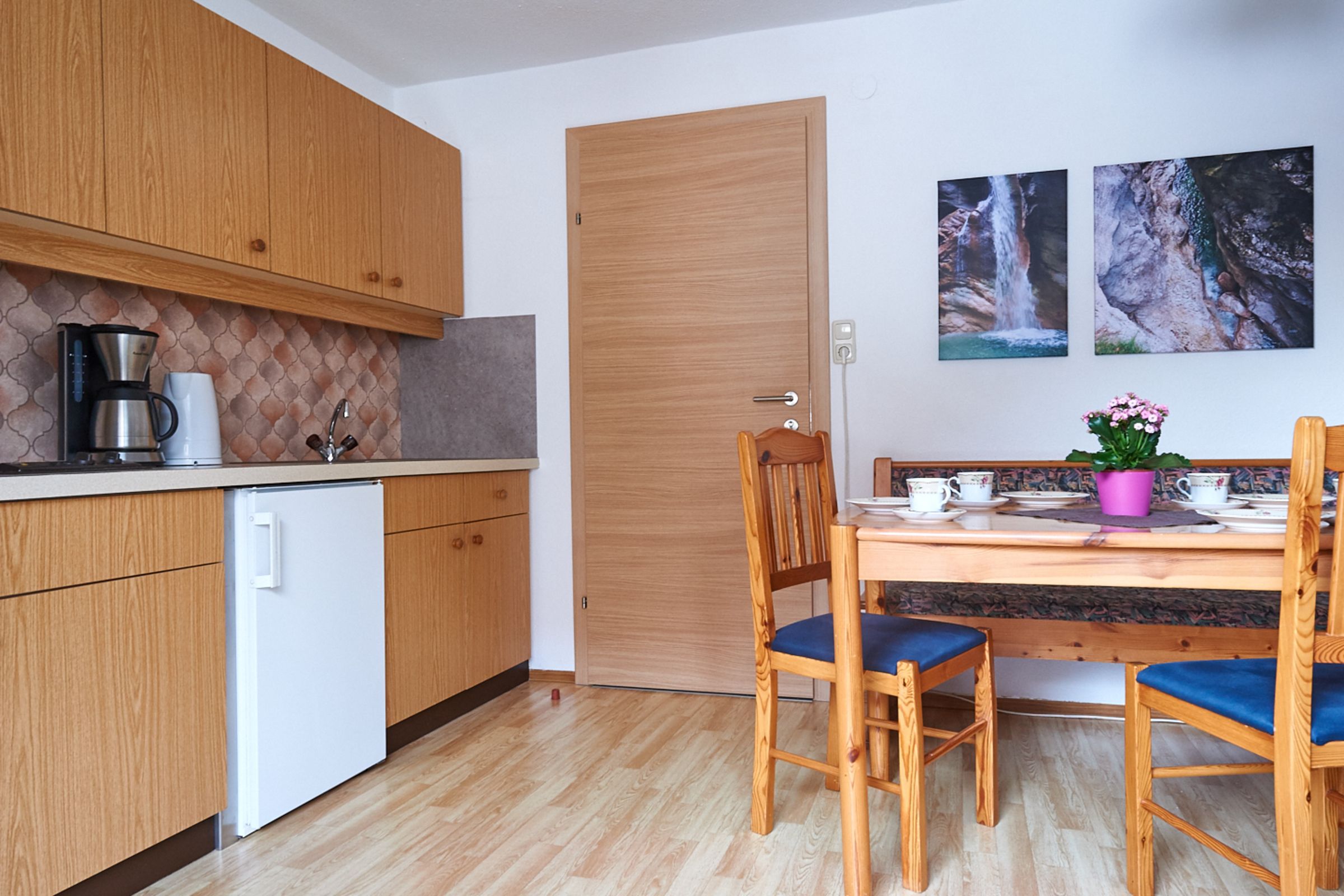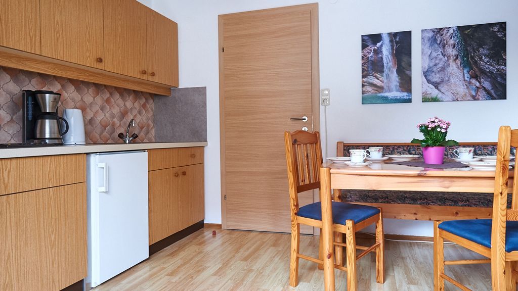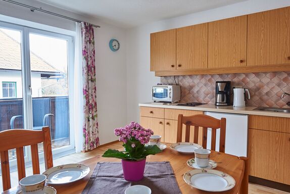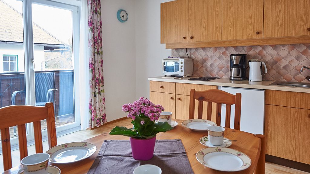 Modern eingerichtete Ferienwohnung liegt nord-östlich im 1. Stock vom Gästehaus. Zwei getrennte Schlafzimmer jeweils mit Doppelbett. Ein Zustellbett kann zusätzlich aufgestellt werden. Modernes Bad mit Dusche und WC. Die Wohnküche ist komplett ausgestattet mit Zugang zum Balkon. Genießen Sie Ihr Frühstück am Balkon in der Morgensonne.
