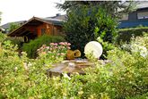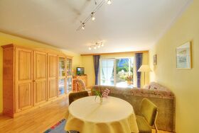 Die Ferienwohnung mit Gartenblick verfügt über Fußbodenheizung, einen direkten Zugang zur Terrasse, eine voll ausgestattete Küchenzeile mit großzügigem Essplatz, ein gemütliches Wohnzimmer mit Flatscreen und SAT-TV, modernes Badezimmer mit Dusche sowie ein Schlafzimmer mit Doppelbett. Schlaf- und Wohnräume sind getrennt.