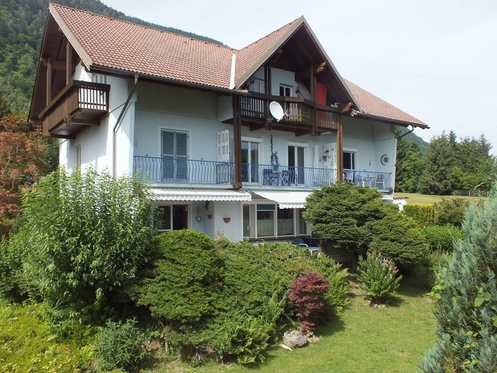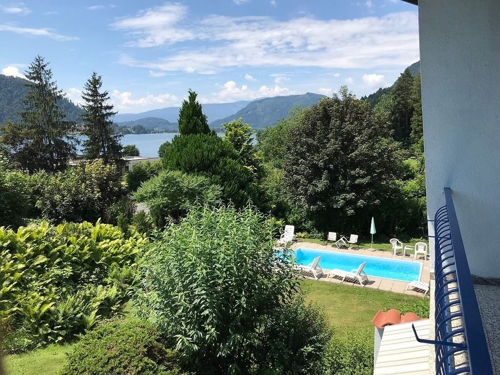Im ersten Stock des Hauses finden Sie die Ferienwohnung Lichtblick mit Sonnenbalkon und Blick auf den Pool im parkähnlichen Garten, sowie den Ossiacher See und die umgebende Berglandschaft.