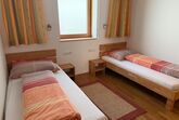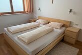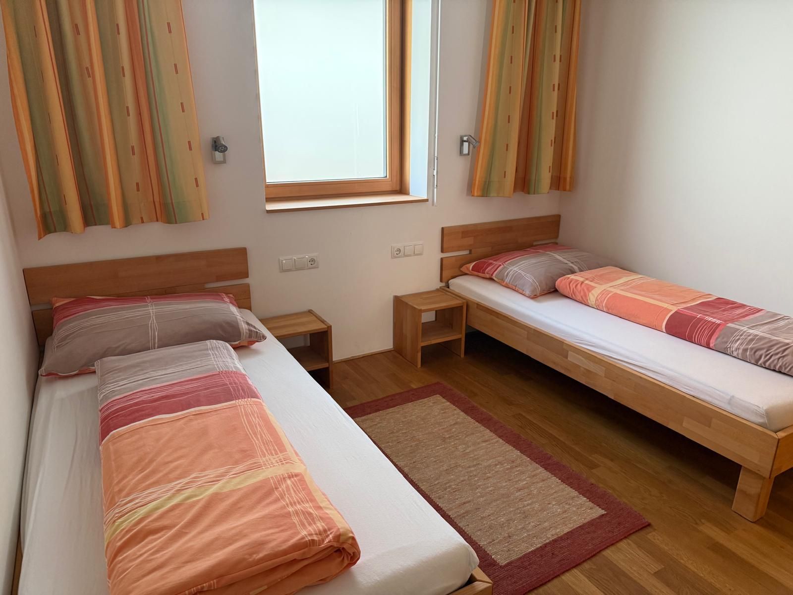 1 Schlafzimmer mit Doppelbett und 1 Schlafzimmer mit 2 Betten. Badezimmer mit Badewanne und Dusche, WC.