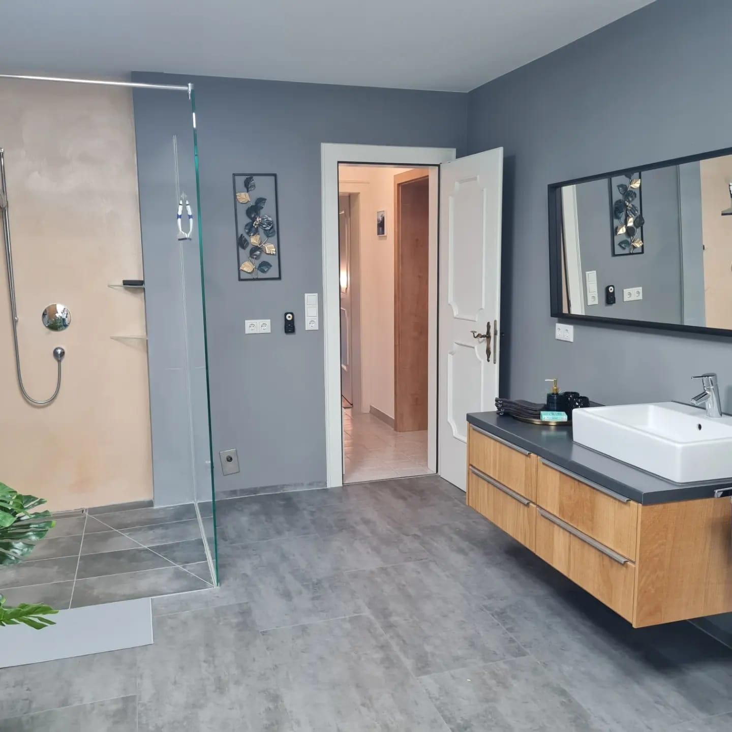 Das Bad verfügt über eine Badewanne, sowie eine große bodentiefe Dusche.