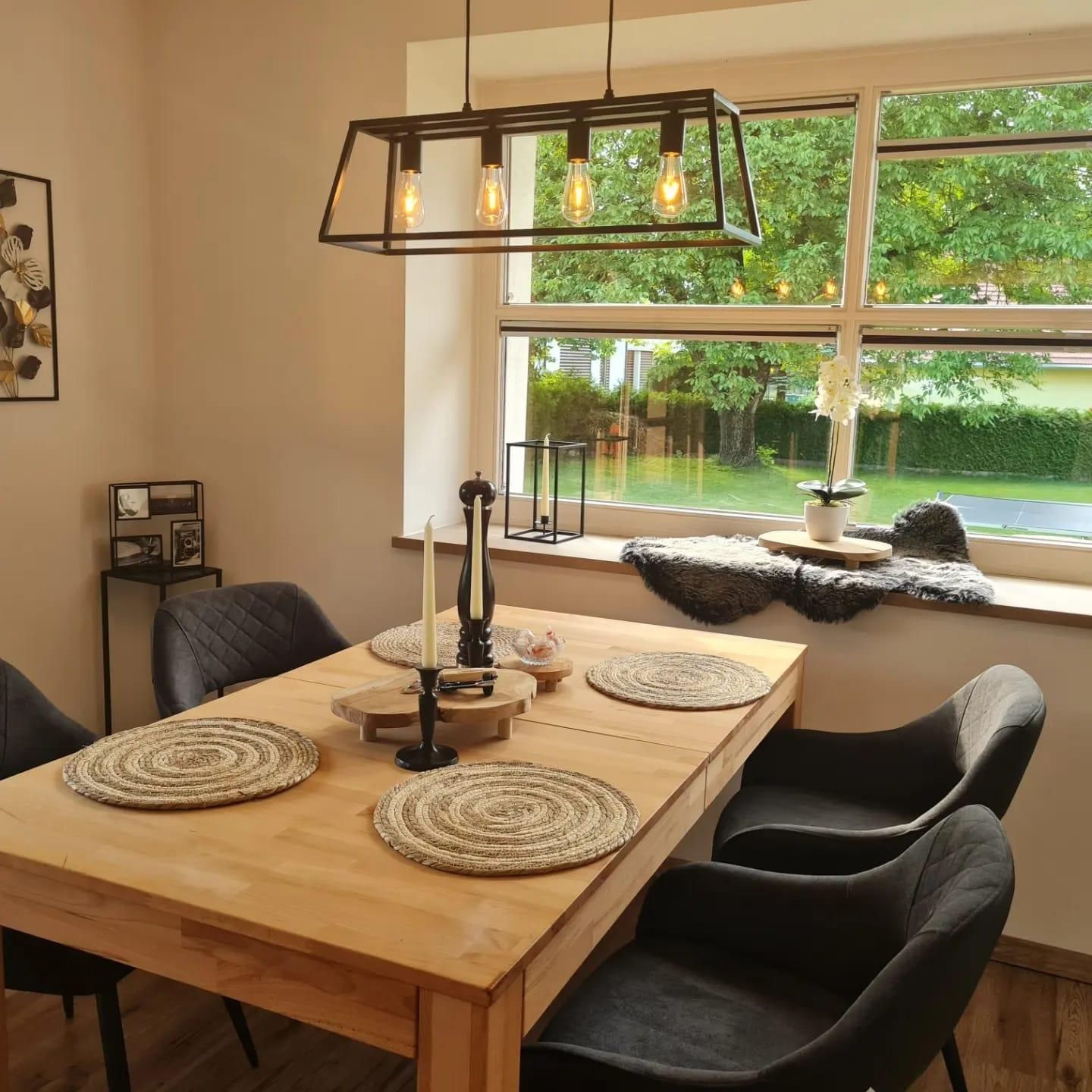Das große Wohnzimmer verfügt über einen ausziehbaren Esstisch, eine Bar und einen Kachelofen, sowie ein Schlafsofa. Ein TV ist natürlich auch vorhanden.