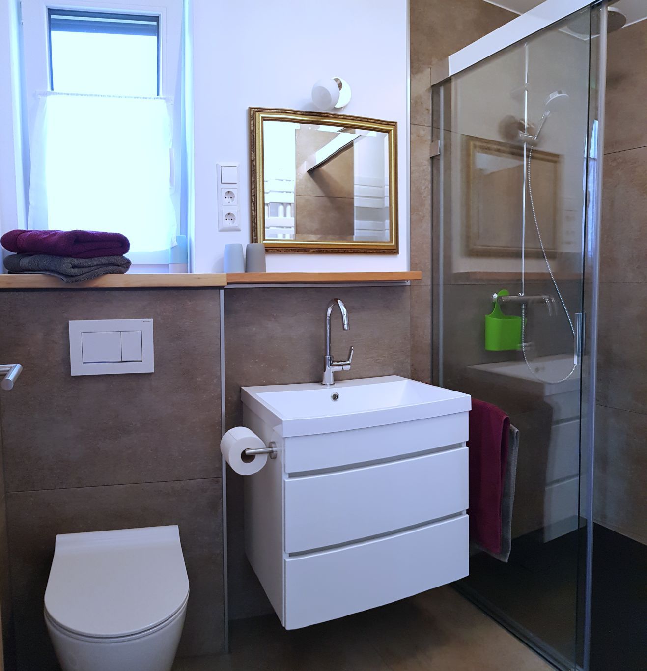 • Badezimmer mit begehbarer Dusche, Haarfön