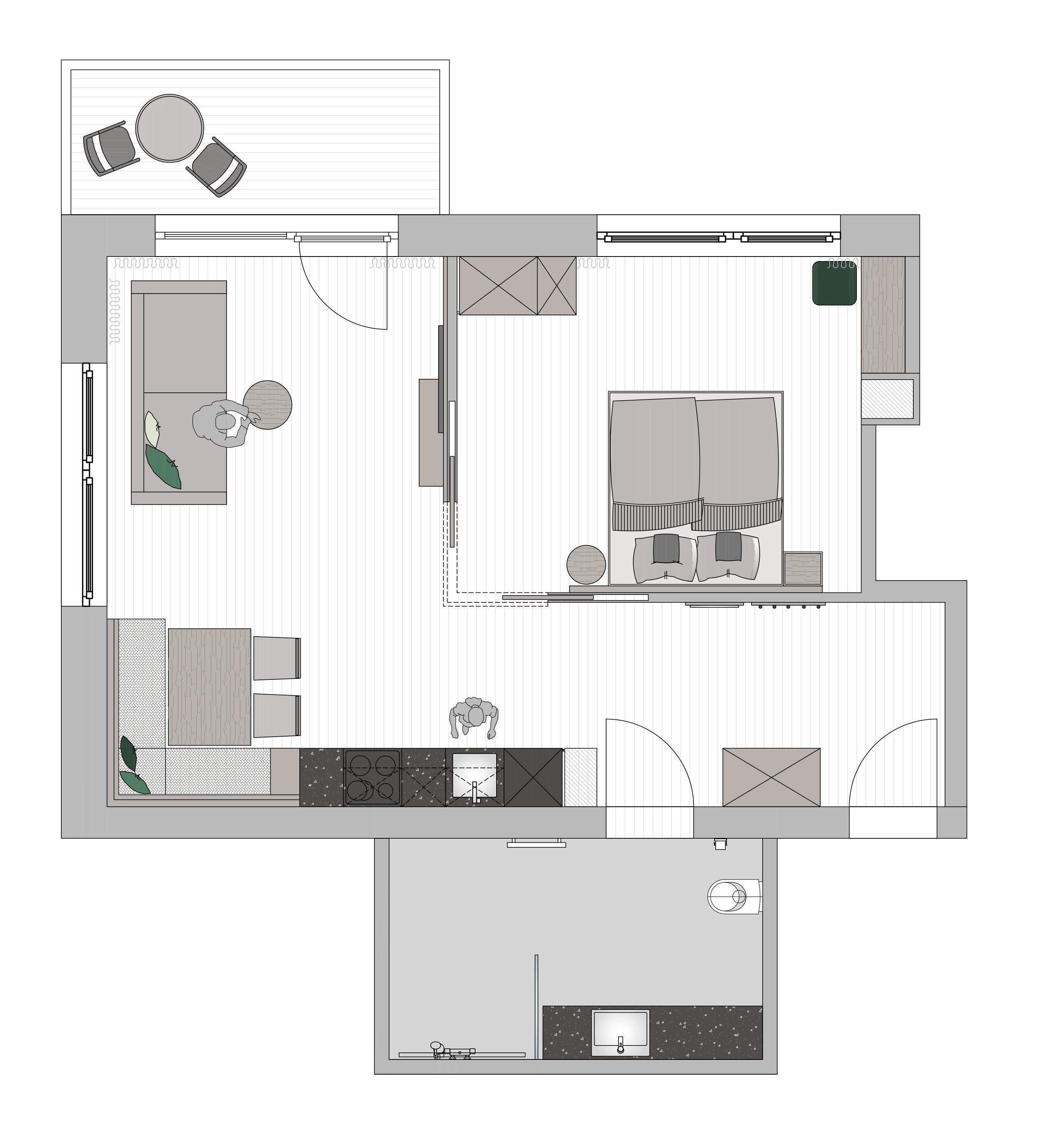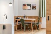 Das großzügige Studio deLuxe bietet Platz für bis zu 4 Personen und kombiniert Komfort mit stilvollem Design. Eine moderne, voll ausgestattete Küche mit einladender Essecke, ein gemütlicher Wohnbereich mit Kabel-TV und Sofa sowie ein westseitiger Balkon laden dazu ein, unvergessliche Momente zu erleben.