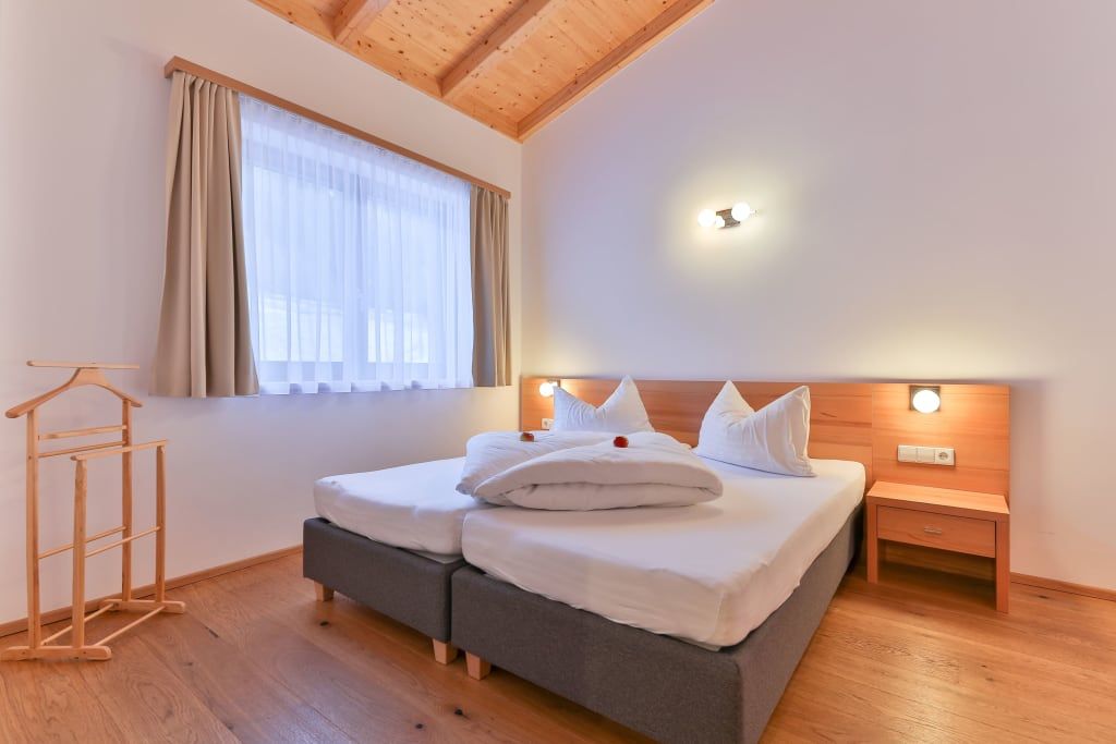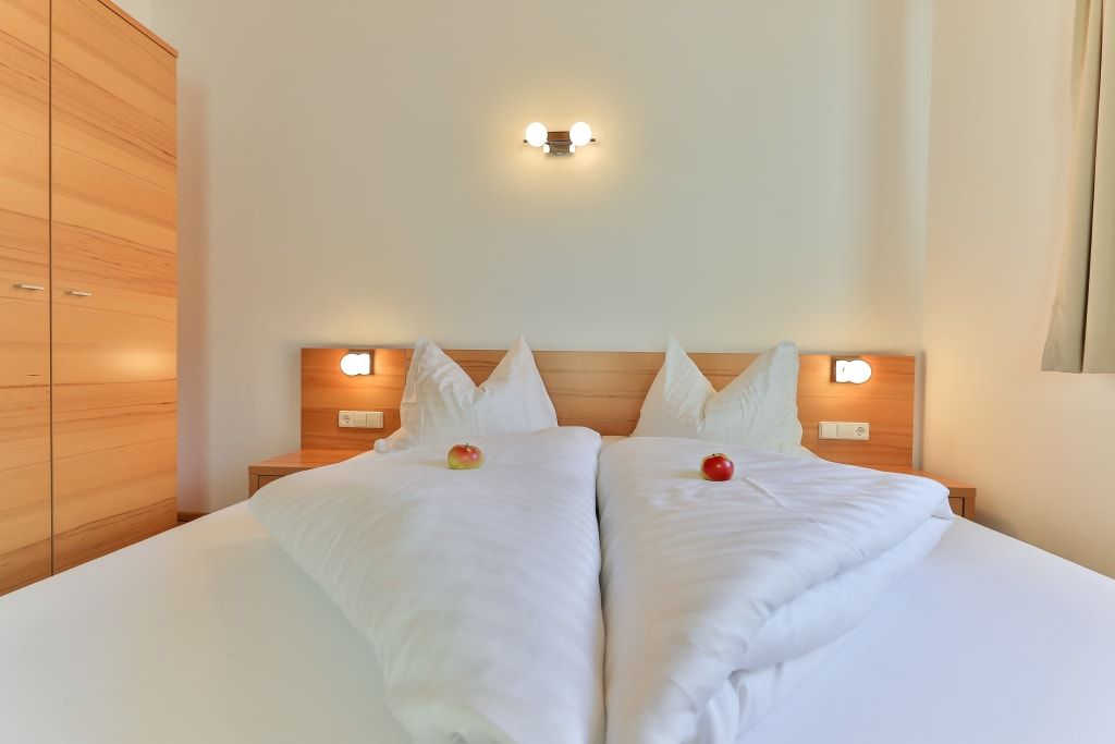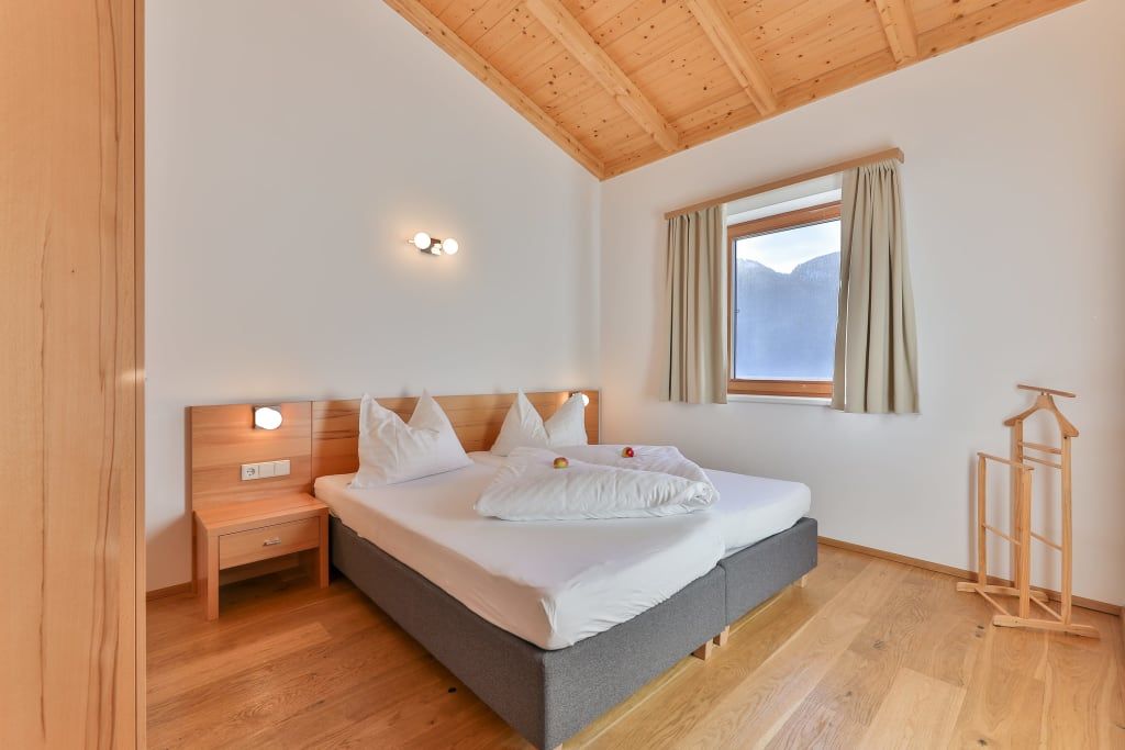 Sehr schönes, 60 m² großes Apartment im Obergeschoß mit 2 Schlafzimmern, 2 Bädern und Wohnbereich mit französischem Balkon Richtung Süden und Blick auf die Karnischen Alpen. Eichendielenparkett, hohe Räume mit Holzbalkendecke, hochwertige Einrichtung in der Holzart Kernbuche sowie Wellness-Dusche.