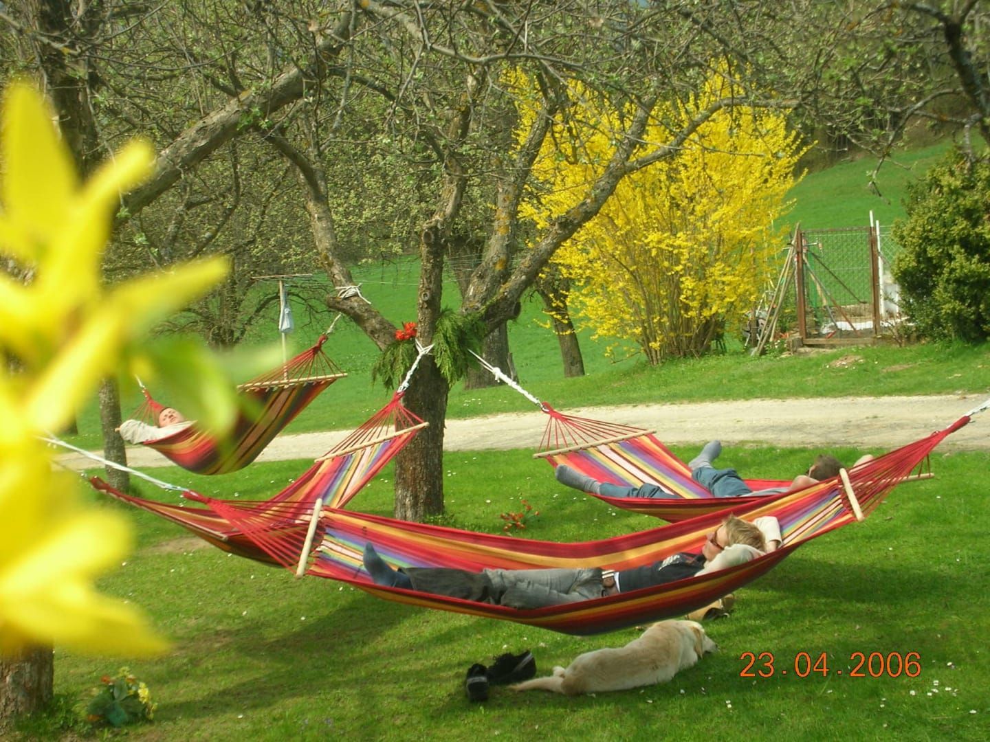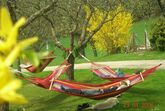 Vor der Wohnung laden 4 Hängematten unter Apfelbäumen so richtig zum Entspannen ein  ...