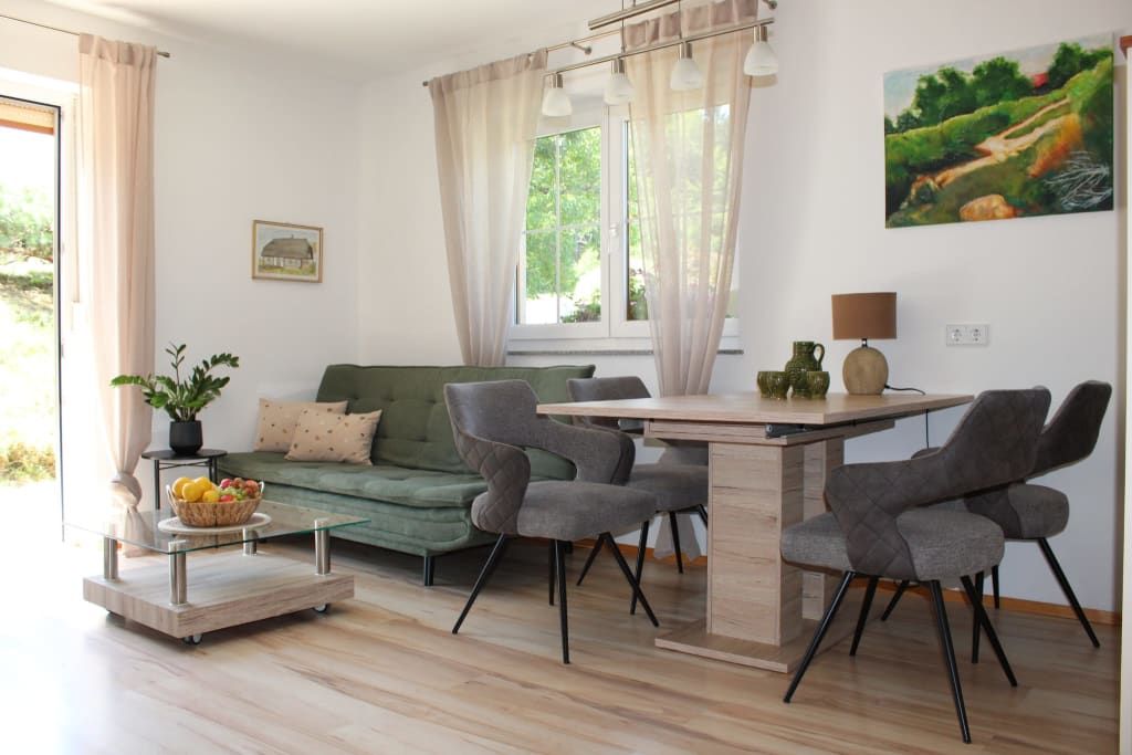 Das ebenerdige, rollstuhlgerechte Panorama Ferienhaus verbindet modernen Komfort mit ländlichem Charme. Herzstück ist das Schlafzimmer mit komfortablem Boxspringbett für zwei Personen, dazu ein Einzelzimmer (bald erweitert) und eine ausziehbare Schlafcouch für bis zu zwei weitere Gäste. Für Familien stehen auf Wunsch Gitterbett und Hochstuhl bereit.