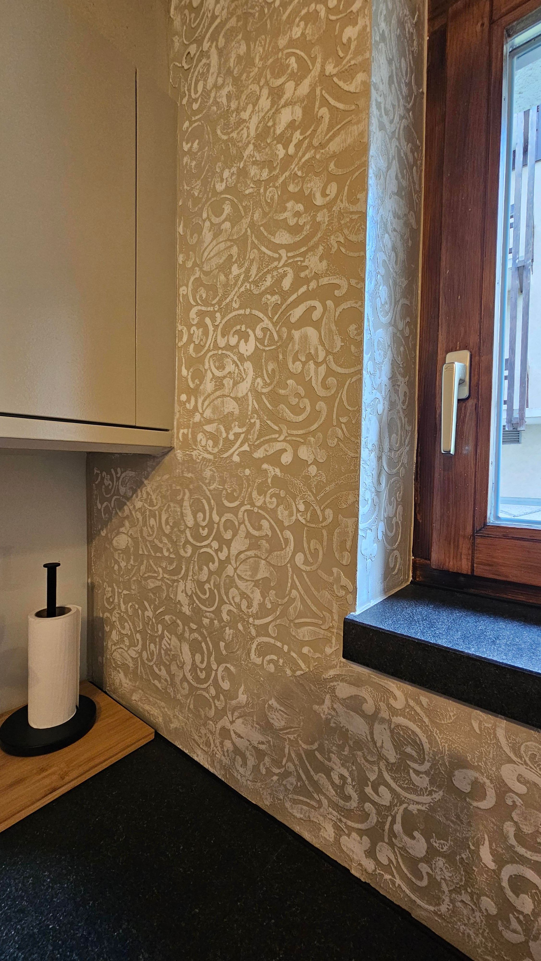 Im Wohnzimmer sorgt eine rustikale Steinwand für gemütlichen Chalet-Charme. Die Küche wurde harmonisch auf die Wandfarbe abgestimmt, wobei die Rückwand mit einer kunstvollen Gipsornamentik beeindruckt. Die beiden Schlafzimmer präsentieren sich jeweils mit einer besonderen Wandgestaltung: Eines mit einer großzügigen Gipswand, das andere mit einer farbenfrohen Swahili-Wand, die dem Raum eine exotische Note verleiht.