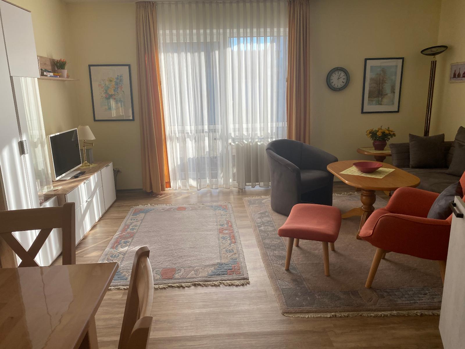 großzügigem Sofa und kleiner Essecke, Sat-TV und Balkon Richtung