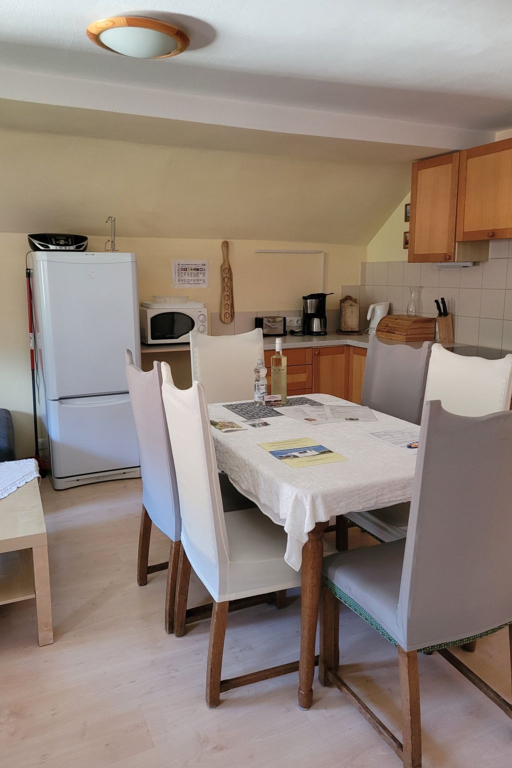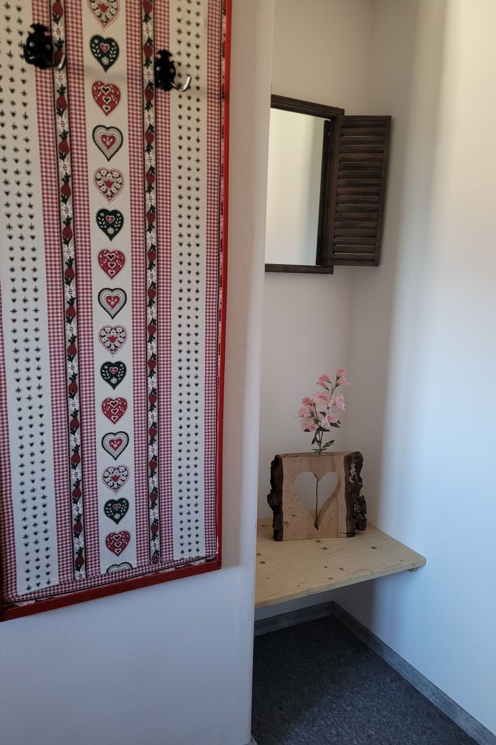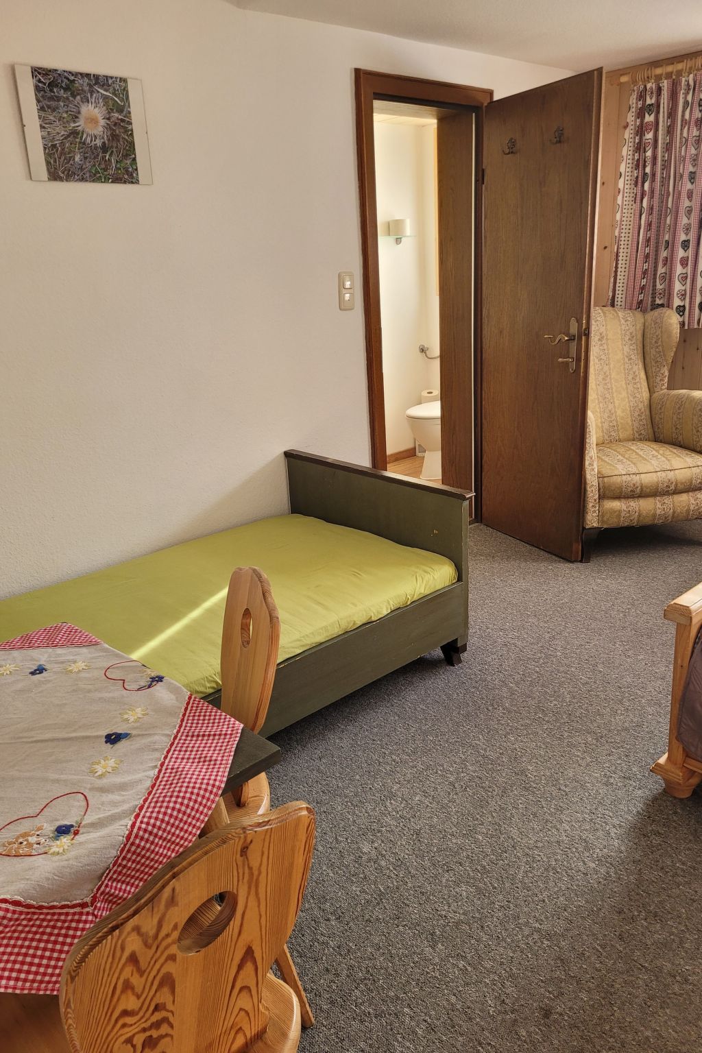 Entdecken Sie unser familiengeführtes Ferienhaus Alpenrose im idyllischen Bergdorf Nesselwängle, gelegen auf 1147 Meter Höhe im malerischen Tannheimer Tal. Wer den atemberaubenden Gipfelblick sucht und die Stille sowie die Ruhe der Tiroler Berge schätzt, findet in unserer Ferienwohnung im zweiten Stock den optimalen Rückzugsort für Erholung. Mitten im Herzen des Ortskerns gelegen, jedoch in einer angenehm ruhigen Lage, bietet die Ferienwohnung die perfekte Basis, um Körper und Geist in der beeindruckenden Naturkulisse des Tals aufleben zu lassen. Die Ferienwohnung Alpenrose ist mit allem Komfort ausgestattet, um bis zu 8 Personen in 3 Schlafzimmern und 2 Bädern bequem zu beherbergen. Die moderne Innenausstattung umfasst eine voll ausgestattete Küche mit Kaffeemaschine, Spülmaschine und Wasserkocher, während für Ihre Wäsche eine Waschmaschine und ein Wäschetrockner (gegen Gebühr) zur gemeinschaftlichen Nutzung im Gebäude bereitstehen. Neben der funktionalen Ausstattung bietet die Wohnung durch ihre Lage im Obergeschoss auch einen faszinierenden Ausblick über das Dorf und die umliegende Berglandschaft. Der Außenbereich des Hauses überzeugt mit genügend Pkw-Stellplätzen vor der Tür und einer Aufladestation für Elektro-Autos, die unseren ökologisch bewussten Gästen zur Verfügung steht. Auch der Garten, zur gemeinschaftlichen Nutzung gedacht, lädt zu entspannten Stunden im Freien ein. Allerdings ist das Grundstück nicht eingezäunt, was Ihnen jedoch ermöglicht, nahtlos in die naheliegende Natur überzugehen. Die Umgebung von Nesselwängle hält für jeden etwas bereit: Der See in 2600 Meter Entfernung lädt zum Baden ein. Wintersportler können sich über die Skilanglaufloipen in 100m Distanz, die Skiabfahrt und Berg-/Seilbahn ebenfalls 700 Meter entfernt sowie über eine Skischule freuen. Zudem gibt es einen Skibus, der nur 100 Meter vom Haus hält. Für den täglichen Bedarf finden Sie einen Lebensmittelhandel in unmittelbarer Nähe von 300 Metern. Lassen Sie sich von der Ferienwohnung Alpenrose ins Herz der Tiroler Alpen entführen und genießen Sie unvergessliche Momente in Nesselwängle. Egal, ob Sie die Stille der Berge suchen, sportlichen Aktivitäten nachgehen wollen oder einfach nur die Seele baumeln lassen möchten – hier finden Sie den idealen Ausgangspunkt für Ihre Erkundungen und Entspannung. Besuchen Sie uns und machen Sie die Alpenrose zu Ihrem Zuhause fernab von zuhause. Basisinformationen - Erlaubte Haustiere: 2 - Art d. Wohnung: Dachgeschoss - Art d. Gebäudes: Mehrparteienhaus - Etage, auf der sich das Objekt befindet: OG2 - Gesamtanzahl d. Stockwerke im Gebäude über EG: 2 - Nichtraucherunterkunft - Höhe über dem Meeresspiegel: 1150 - Schlafzimmeranzahl: 3 - Badezimmeranzahl: 2 Top Merkmale - WLAN - Heizung: überall - Garten: zur gemeinschaftlichen Nutzung - Private PKW-Stellplätze insgesamt für diese Unterkunft: 2 - ㄴ davon Garagenstellplätze: keinen - ㄴ davon Carport-Stellplätze: keinen - ㄴ davon private Außenstellplätze: keinen Schlafen Schlafzimmer 1 - Doppelbett (größer als 1,80 m Breite) - Einzelbett Schlafzimmer 3 - Doppelbett (größer als 1,80 m Breite) - Einzelbett Schlafzimmer 5 - Doppelbett (größer als 1,80 m Breite) Badezimmer Badezimmer 1 - Dusche - Waschbecken - Föhn Badezimmer 3 - Dusche - Waschbecken - Toilette - Föhn Sanitäre Einrichtungsgegenstände in der Ferienunterkunft - 2x Dusche - 2x Toilette - Föhn Kochen/Wohnen - Kaffeemaschine: Kaffeemaschine - Kühl-/Gefrierschrank: Gefrierfach, Tiefkühlschrank, Kühlschrank - Herd: Herd - Dunstabzugshaube - Backofen - Toaster - Mikrowelle - Wasserkocher - Spülmaschine - Geschirrtücher - Anzahl Esstische: 1 - Gesamtzahl Sitzplätze: 8 Entertainment - Fernseher: TV, Antenne/DVBT-TV, Kabel-TV, Sat.-TV - Radio - CD-Player Für Kinder - Kinderstuhl Hauswirtschaft - Waschmaschine: zur gemeinschaftlichen Nutzung im Gebäude - Wäschetrockner: zur gemeinschaftlichen Nutzung im Gebäude - Staubsauger - Ventilator: keinen Nachhaltigkeit - Aufladestation für Elektro-Autos Umgebung - Lebensmittelhandel: 300 m - Cafés/Restaurants: 100 m - Bahnhof: 19,9 km - Flughafen: 100,0 km - nächste Haltestelle ÖPNV: 100 m - Strand: 700 m - Grasstrand: 2,6 km - See: 2,6 km - Wassersport: 2,6 km - Bootsverleih - Angelplatz: 2,6 km - Spielplatz: 200 m - Öffentliches Schwimmbad: 2,6 km - Wanderweg: 200 m - Reitmöglichkeit: 3,4 km - Ski - Skiabfahrt: 700 m - Skischule: 700 m - Skilanglauf: 500 m - Skibus: 100 m - Berg-/Seilbahn: 700 m