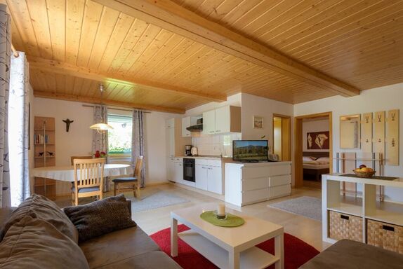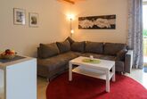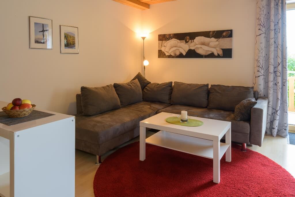 Die modern und komfortabel ausgestattete Ferienwohnung für 2 Personen befindet sich im Erdgeschoß (Hochparterre) und ist ohne Stufen erreichbar. Die Ferienwohnung besteht aus 1 Schlafzimmer mit Doppelbett, großem Wohnbereich mit gemütlicher Couchecke, Essecke und Küchenzeile mit Spülmaschine, Mikrowelle, Kaffeemaschine, Wasserkocher und Toaster, SAT-TV, Radio, Dusche/WC und Balkon mit Blick in unseren großen Garten. kostenloses W-LAN. Auf Wunsch - Brötchenservice! Für Nichtraucher!