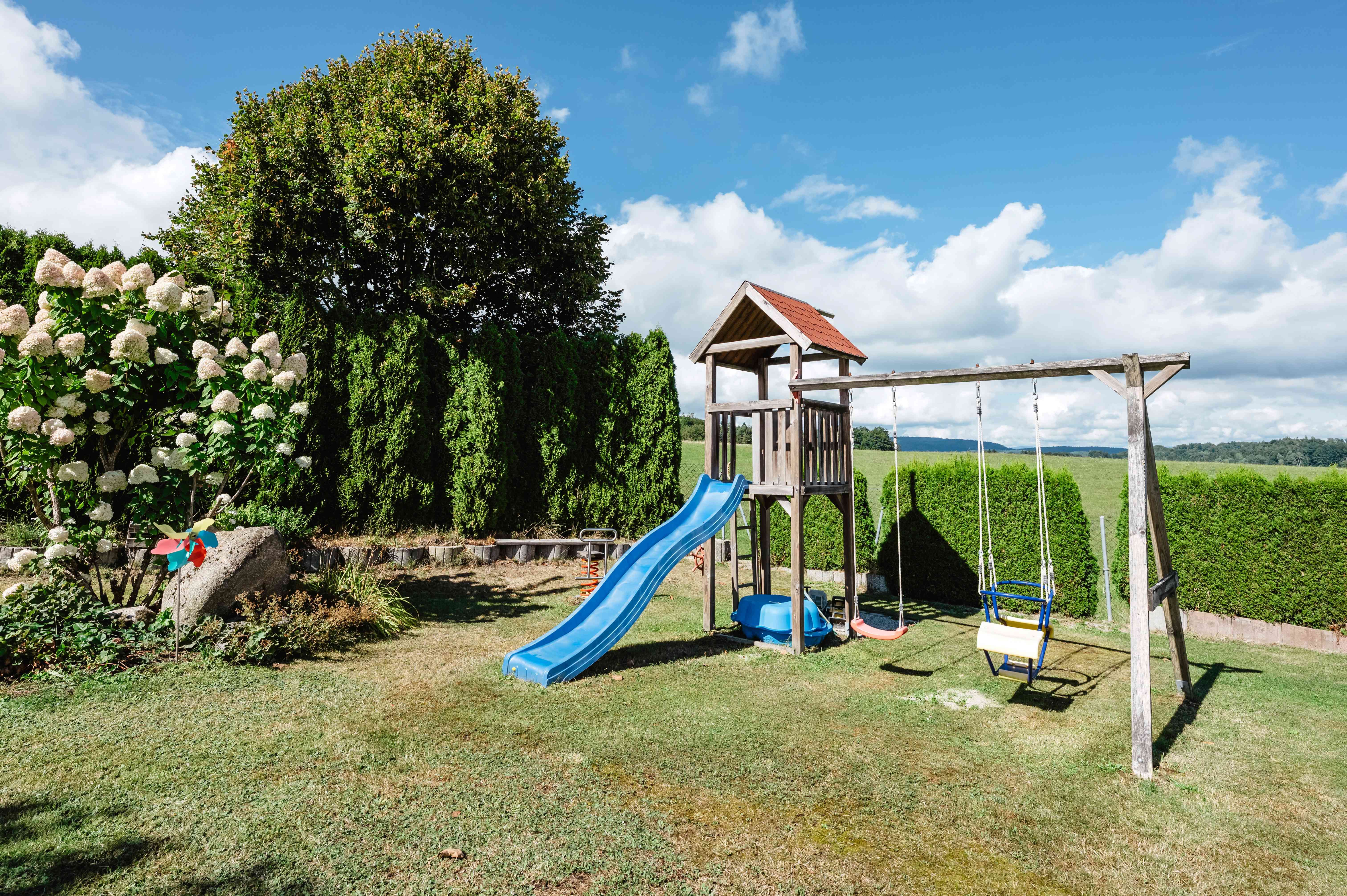 Familienfreundliche Ferienwohnung in ruhiger Lage am Ortsrand! Die geräumige Wohnung befindet sich im Erdgeschoss und verfügt über einen separaten Eingang. Das einladende Wohnzimmer ist ausgestattet mit einem wärmenden Kamin, einer bequemen Sitzgarnitur, Smart-TV und bietet Zugang zur möblierten Terrasse in Ost- und Südausrichtung. Zwei Schlafzimmer mit Doppelbetten sind vorhanden, und es gibt in jedem Raum Platz für ein zusätzliches Bett oder Kinderbett. Die Küche ist komplett eingerichtet mit einer Sitzgruppe, Geschirr, Wasserkocher, Kaffeevollautomat, Spülmaschine und einem Herd mit Backofen für gesellige Kochabende. Das Badezimmer ist mit einer Dusche/WC, Handtüchern und einem Hocker ausgestattet und bietet ausreichend Ablagefläche. Ein Trockenraum steht ebenfalls zur Verfügung. Besonders geschätzt wird der direkte Zugang zur großen Wiese und dem Spielplatz dazu gemütliche Sitzmöglichkeiten. Die Spielscheune mit Bibliothek, Tischtennis, Dart, Kicker Kasten sind bei bei jedem Wetter gefragt. Es gibt viel in der näheren und weiteren Umgebung zu entdecken.