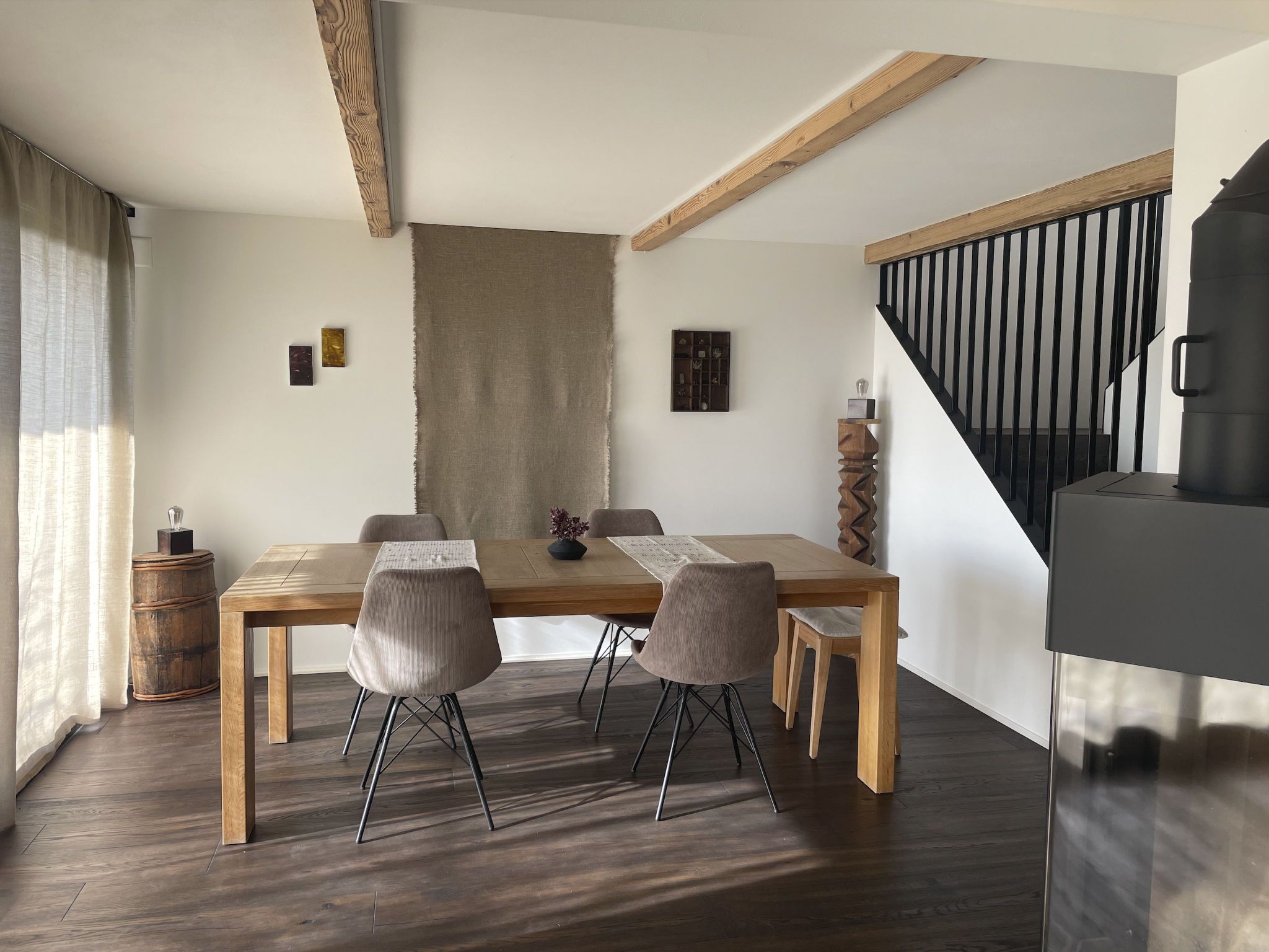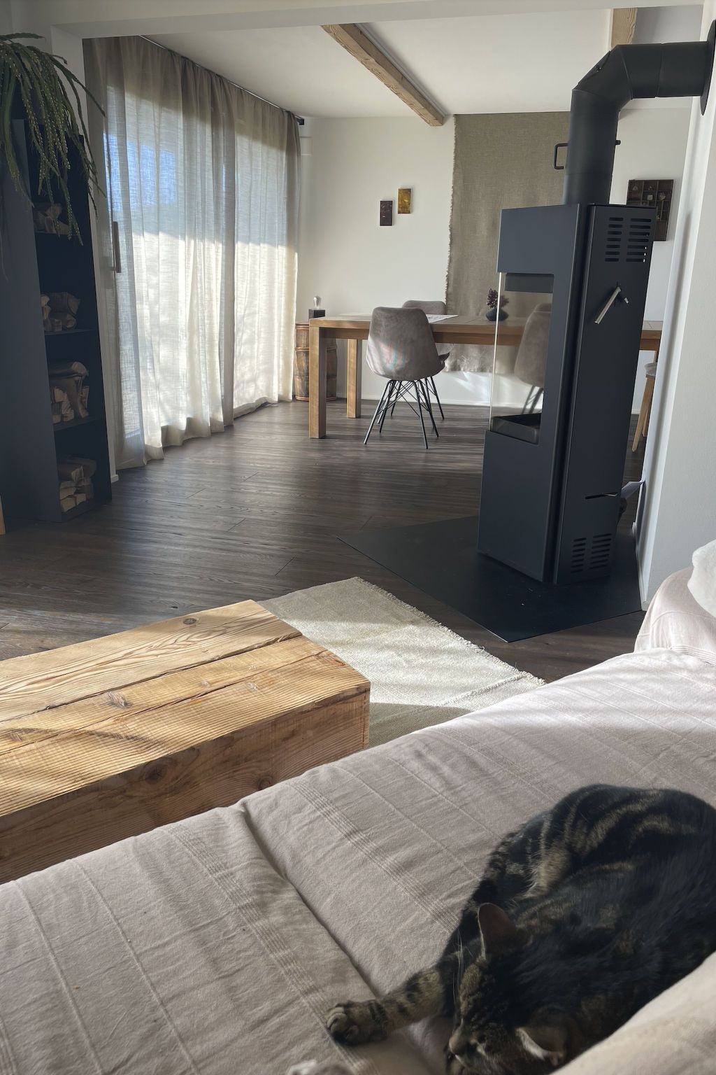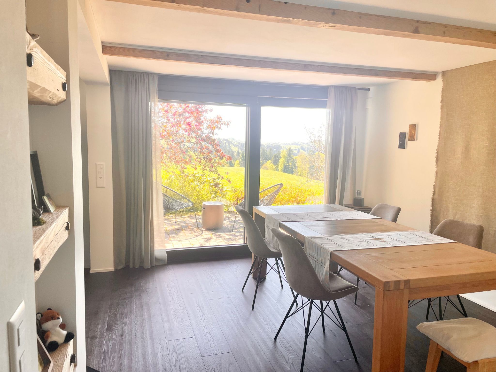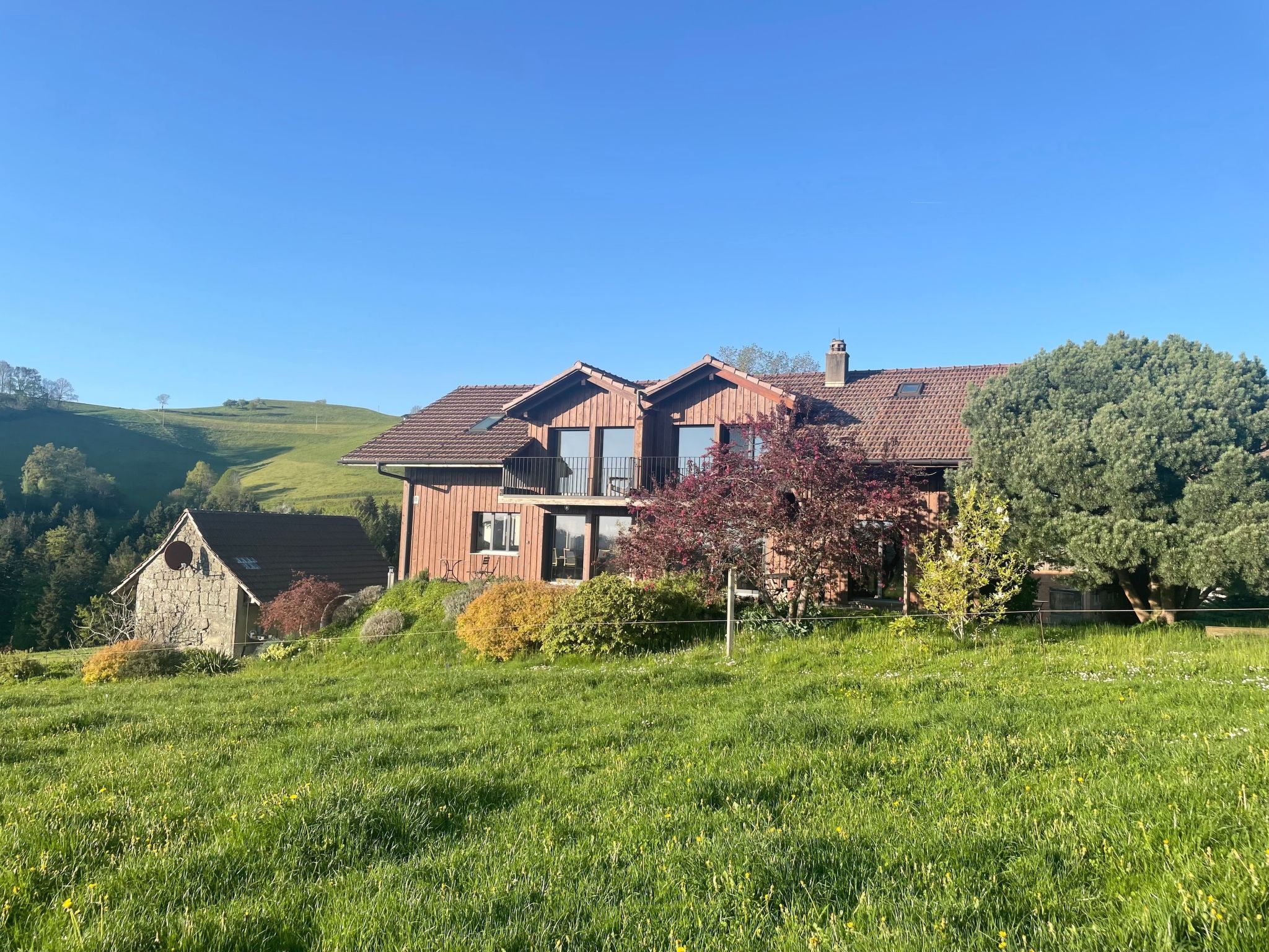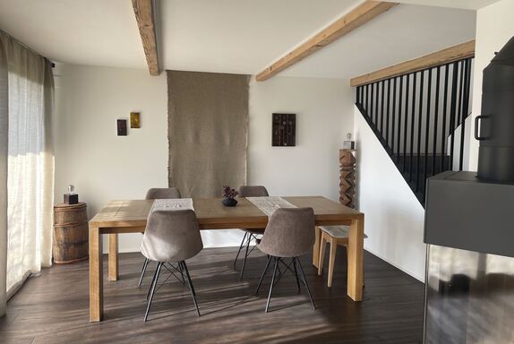 Suchst du einen Ort, an dem du abseits vom Chaos aufatmen und die Schönheit der Natur geniessen kannst? Dann ist unsere modern und stilvoll renovierte 2-stöckige Wohnung genau das Richtige: Diese liegt auf einem Bauernhof im Naturpark Gantrisch - umgeben von Wäldern, Wiesen, Hügeln sowie mit Bergen und kleinen Bade-Flüssen in der Nähe. Geniesse unser Trinkwasser aus eigener Quelle, unsere Wanderwege & Aussichtspunkte, sternklare Nächte und tägliche Sonnenuntergänge vom Wohnbereich aus. Moderner Komfort, rustikaler Charme und schönste Aussicht Bei schönem wie auch bei regnerischem Wetter bietet die Wohnung alles, um es dir zuhause gemütlich zu machen: Das Lichtkonzept sorgt jederzeit für ein gemütliches Ambiente und der Cheminée-Ofen wärmt auch an kühleren Tagen. Die vollausgestattete Küche lädt zum Kochen ein und die private, grosszügige Terrasse bietet dir einen zusätzlichen Esstisch mit Mittags- und Abendsonne. Geniesse auch den herrlichen Ausblick auf dem privaten Balkon auf die liebliche Hügellandschaft mit Wäldern, wo täglich Rehe und Füchse unterwegs sind. Für dein Sporttraining bietet dir die Wohnung eine Fitness-Ecke, W-Lan und Drucker ermöglichen dir ein bequemes Homeoffice und zur Unterhaltung & Inspiration findest du ausgewählte Literatur, Spiele und lokale Kunstwerke (kein Fernseher vorhanden). Die Innenarchitektur habe ich persönlich mit viel Liebe zum Detail gestaltet: Es war mir wichtig die alte Baustruktur sichtbar zu machen, so dass der traditionelle Charme auch mit modernem Komfort erhalten bleibt. Malerische Umgebung und Outdoor-Aktivitäten Die Wohnung liegt im Naturpark Gantrisch, welcher eine unerschöpfliche und leicht zugängliche Naturvielfalt in den Berner Voralpen bietet . Der «Gantrisch Panoramaweg» ist einer der aussichtsreichsten Wanderwege in den Berner Voralpen (20 Minuten Autofahrt entfernt), ebenfalls sehr empfehlenswert ist der Wanderweg Guggershörnli. Die kleinen, naturbelassene Badeflüsse «Schwarzwasser» oder «Sense» bieten dir wunderschöne Orte, um dich zu sonnen und im Freien zu grillen (5 oder 20 Minuten Autofahrt entfernt). In der Umgebung wachsen diverse Wildkräuter, Pilze oder Holunderbäume, wo du gratis sammeln kannst (Für Anfänger geeignet: Bärlauch). Jede Jahreszeit lädt ein zum Spazieren oder Wandern – auch direkt ab Haus oder ab nahegelegenen Aussichtspunkten (z.B. «Bütschelegg»). In 35 Minuten Autofahrt erreichst du auch die Freiburger Voralpen am Schwarzsee, wo du via Gondeln bequem in auf die Bergspitzen mit Restaurants fahren kannst. Im Winter bietet der Schwarzsee mit den Kaisereggbahnen ein mittelgrosses Skigebiet mit diversen Angeboten. Für mehr Tipps: Frag mich! Gerne gebe ich dir z.B. eine Liste mit meinen persönlichen Lieblingsrestaurants in Bern, Thun und Fribourg: Alle drei Städte erreichst du in 30 Minuten Autofahrt. Auch helfe ich dir Indoor-Kulturangebote nach deinen Interessen zu finden. Basisinformationen - Erlaubte Haustiere: keins - befindet sich in: Wohnsiedlung - Art d. Gebäudes: Doppelhaushälfte - Etage, auf der sich das Objekt befindet: EG - Gesamtanzahl d. Stockwerke im Gebäude über EG: 2 - letzte umfassende Renovierung: 2022 - Nichtraucherunterkunft - Schlafzimmeranzahl: 1 - Badezimmeranzahl: 1 Top Merkmale - WLAN - Klimaanlage: teilweise - Heizung: überall - Fußbodenheizung: überall - Balkon - Terrasse - Garten: zur gemeinschaftlichen Nutzung - Private PKW-Stellplätze insgesamt für diese Unterkunft: 1 - ㄴ davon private Außenstellplätze: 1 Schlafen Schlafzimmer 1 - Doppelbett (1,80m Breite) Badezimmer Badezimmer 1 - Dusche Gäste-WC - Toilette Kochen/Wohnen - Kaffeemaschine: Espressokanne, Kaffeemaschine - Kühl-/Gefrierschrank: Gefrierfach, Kühlschrank - Herd: Elektroherd - Backofen - Wasserkocher - Spülmaschine - Geschirrtücher - Größe der Küche: 10 m² - Anzahl Esstische: 1 - Gesamtzahl Sitzplätze: 6 - Anzahl Wohnzimmer: 1 - Ofen Entertainment - Klavier - Gesellschaftsspiele für Erwachsene Hauswirtschaft - Bügeleisen - Staubsauger - Rauchmelder Nachhaltigkeit - Abfallrecycling - Bioabfall verfügbar - Hausisolierung Außenbereich - Outdoormöbel Umgebung - Aussicht: Berg, Garten, Wald, Wiese, Tal - Lebensmittelhandel: 9 m - Bahnhof: 9,0 km - Flughafen: 20,0 km - Autobahn: 20,0 km - Wasser (Meer, See etc.): 4,0 km - Öffentliches Schwimmbad: 25,0 km - Wanderweg: 0 m - Ski - Skiabfahrt: 30,0 km - Berg-/Seilbahn: 30,0 km Besonderheiten - Ferien auf dem Bauernhof