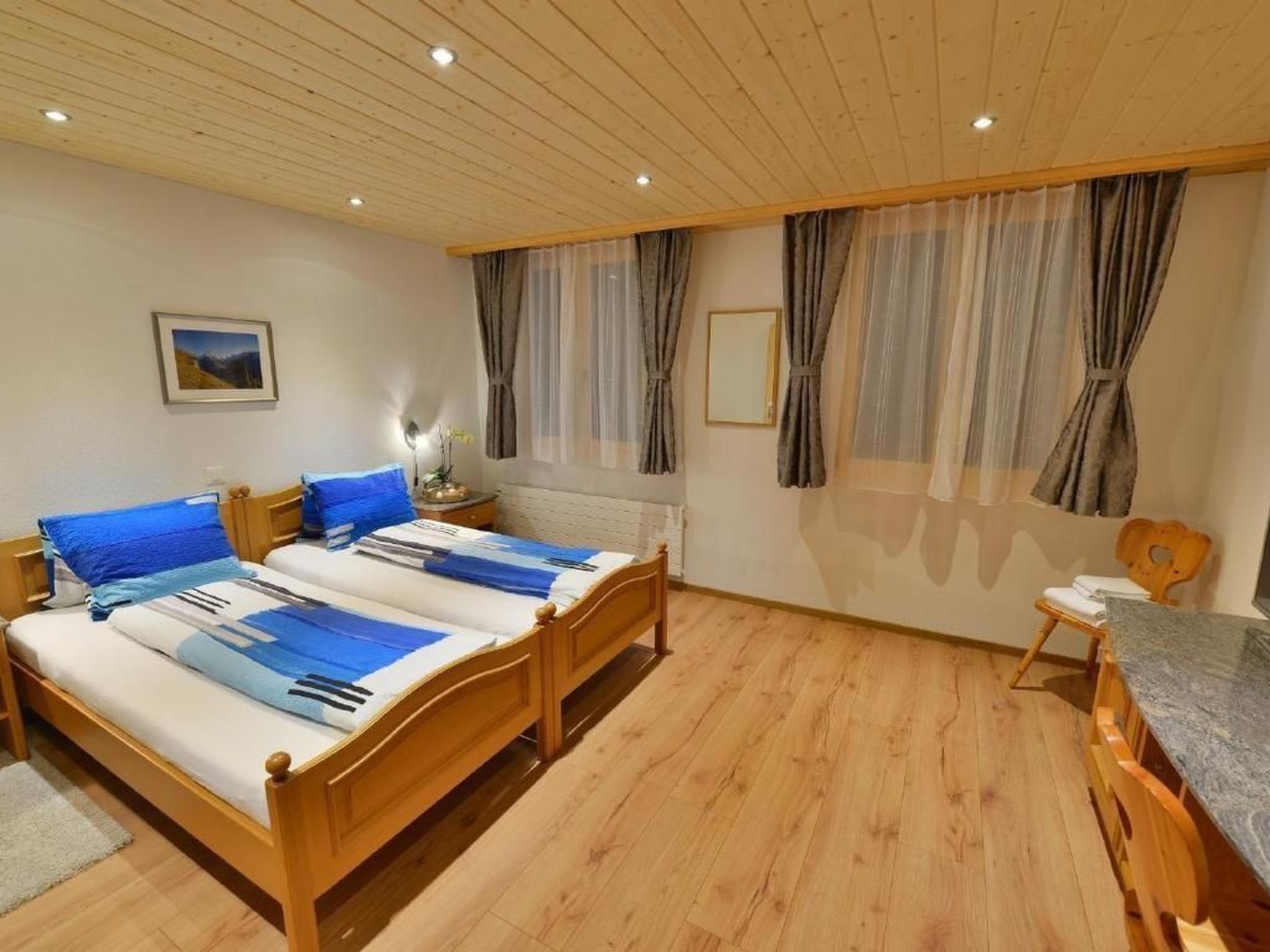 Die Ferienwohnung bietet einen Atemberaubenden Ausblick auf die Eigernordwand, ist zentral gelegen und in 5 Gehminuten vom Bahnhof Grindelwald entfernt. Küche: Die gemütliche Küche mit Eckbank hat eine 4er Ceran-Herdplatte und eine komplette Kücheneinrichtung mit Besteck & Geschirr inkl. Töpfe und Pfannen. Kühlschrank mit Gefrierfach, Backofen, Spülmaschine inkl. Pulver, Handspülmittel und Küchenwäsche, Wasserkocher, Toaster, Handmixer, Mikrowelle sowie Raclette Ofen und Fondue Utensilien finden Sie alles in dieser Küche. Schlafzimmer: Die Wohnung verfügt über 3 Schlafzimmer. - Ein Süddoppelzimmer mit separatem WC (1 Bettgestell mit 2 separaten Matratzen 90x200cm) und Südbalkon mit Blick zur Eigernordwand. - Ein Norddoppelzimmer (2 Bettgestell mit separaten Matratzen 90x200cm) - Ein Einzelzimmer zur Ostseite (1 Bettgestell 1 Matratze 90x190cm). Jedes Schlafzimmer ist mit einem Schrank ausgestattet und Nachttische Bettwäsche ist vorhanden und im Preis inbegriffen. Badezimmer: Das Badezimmer ist mit einer Badewanne, Lavabo und Toilette ausgestattet. Handseife, Haartrockner, Toilettenpapier und Frottierwäsche werden zur Verfügung gestellt. Wohnzimmer: Das Wohnzimmer beinhaltet ein großes Sofa mit Blick auf die originelle Wohnwand mit der weltberühmten „Heckmair-Route“ in der Eigernordwand. Außerdem in der Wohnwand integriert; Flachbildfernseher und Lesenische. Direkt vom Wohnzimmer aus, gelangen Sie auf den Südbalkon mit herrlichem Blick auf die Eigernordwand. Bei schönem, warmen, Wetter, können Sie dort die Seele baumeln lassen und Life, die Heckmair-Route mit verfolgen. Separee: Dieses gemütliche, kleine Zimmer, können Sie zum essen, spielen oder lesen benutzen. WLAN ist im Preis inbegriffen. 2 Parkplätze werden für diese Wohnung reserviert für Sie. Sonstige Wohnzimmerausstattung (Wohnzimmer1): 1 Fernseher Sonstige Schlafzimmereinrichtung (Schlafzimmer1): 1 Schrank2 Nachttische1 Komode Sonstige Kücheneinrichtung (Küche1): FilterkaffemaschineRaclette OfenFondue SetWasserkocher Sportmöglichkeiten in der Umgebung: Bergsteigen, Eislaufen, Golfplatz, Klettern, Mountainbiking, Paragliding, Radtouren, Rodeln, Ski (alpin), Ski (Langlauf) Basisinformationen - Erlaubte Haustiere: keins - Unterkunftstyp: Ferienwohnung - befindet sich in: Wohnsiedlung - Etage, auf der sich das Objekt befindet: OG1 - Anbieter wohnt auf dem Grundstück - keine Gruppenbuchung - keine Jugendgruppen - Nichtraucherunterkunft - Schlafzimmeranzahl: 3 - Badezimmeranzahl: 1 Top Merkmale - WLAN - Klimaanlage: keine - Heizung: überall - Balkon - Private PKW-Stellplätze insgesamt für diese Unterkunft: 1 - ㄴ davon private Außenstellplätze: 1 Schlafen Schlafzimmer 1 - Doppelbett (1,80m Breite) - Schlafzimmer abdunkelbar Schlafzimmer 3 - 2x Einzelbett - Schlafzimmer abdunkelbar Schlafzimmer 5 - Einzelbett - Schlafzimmer abdunkelbar Badezimmer Badezimmer 1 - Badewanne mit Duschvorrichtung - Waschbecken - Toilette - Föhn Gäste-WC - Toilette Kochen/Wohnen - Kaffeemaschine: Filter-Kaffeemaschine - Kühl-/Gefrierschrank: Gefrierfach, Kühlschrank - Herd: Herd - Dunstabzugshaube - Backofen - Toaster - Mikrowelle - Wasserkocher - Spülmaschine - Geschirrtücher - Größe der Küche: 10 m² - Anzahl Esstische: 1 - Gesamtzahl Sitzplätze: 5 - Anzahl Wohnzimmer: 1 Entertainment - Fernseher: TV, Kabel-TV Hauswirtschaft - Waschmaschine: zur gemeinschaftlichen Nutzung im Gebäude - Wäschetrockner: zur gemeinschaftlichen Nutzung im Gebäude - Wäscheständer - Staubsauger - Reinigungsprodukte Nachhaltigkeit - Abfallrecycling - Bioabfall verfügbar - Glasrecycling verfügbar - Papierrecycling verfügbar - Kunststoffrecycling verfügbar Umgebung - Aussicht: Berg - Lebensmittelhandel: 700 m - Cafés/Restaurants: 600 m - Bahnhof: 600 m - Spielplatz: 700 m - Fahrrad-Verleih: 700 m - Berg-/Seilbahn: 800 m