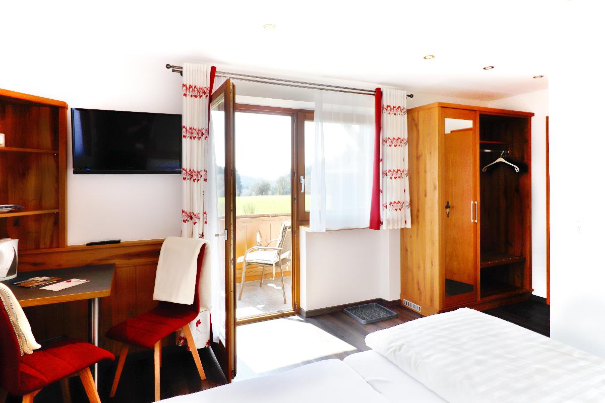 Doppelzimmer bayerisch-edel, ca. 16m² - 18 m², Panoramabalkon, Tisch mit Stühlen, Kleiderschrank, Bad mit Dusche und WC, Föhn, Kosmetikspiegel, Radio, TV, Wasserkocher, Geschirr.