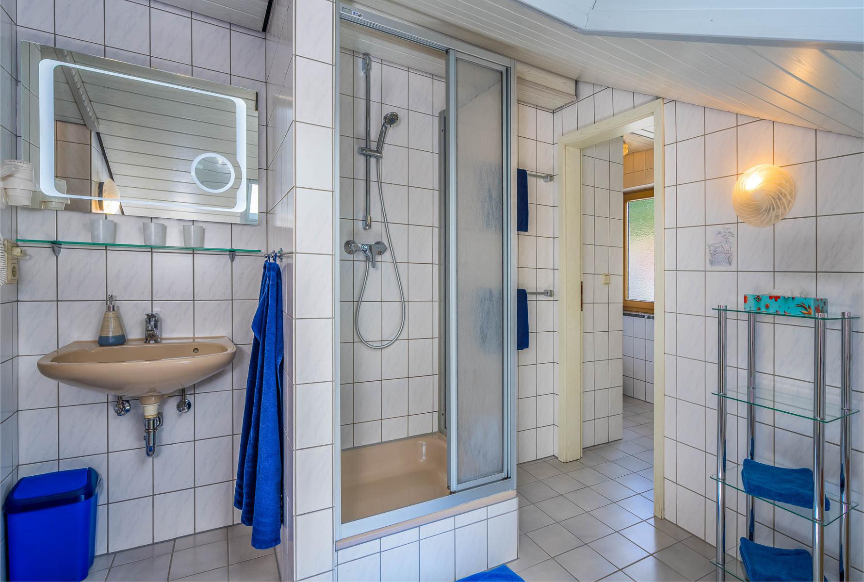 • Badezimmer mit Dusche, Ganzkörperspiegel, Schminkspiegel und Föhn
