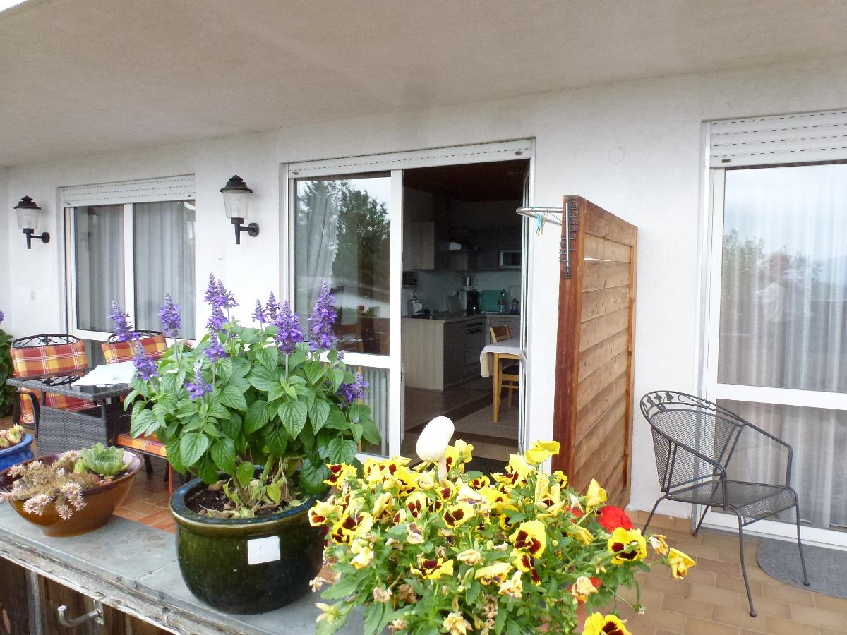 Zu der Wohnung gehört eine Überdachte Terrasse mit herrlichen Blick auf die Berge in südlicher Richtung,wo das Frühstücken und Grillmöglichkeit Freude macht.