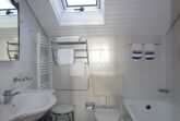 Bad ist mit Badewanne Dusche und WC.