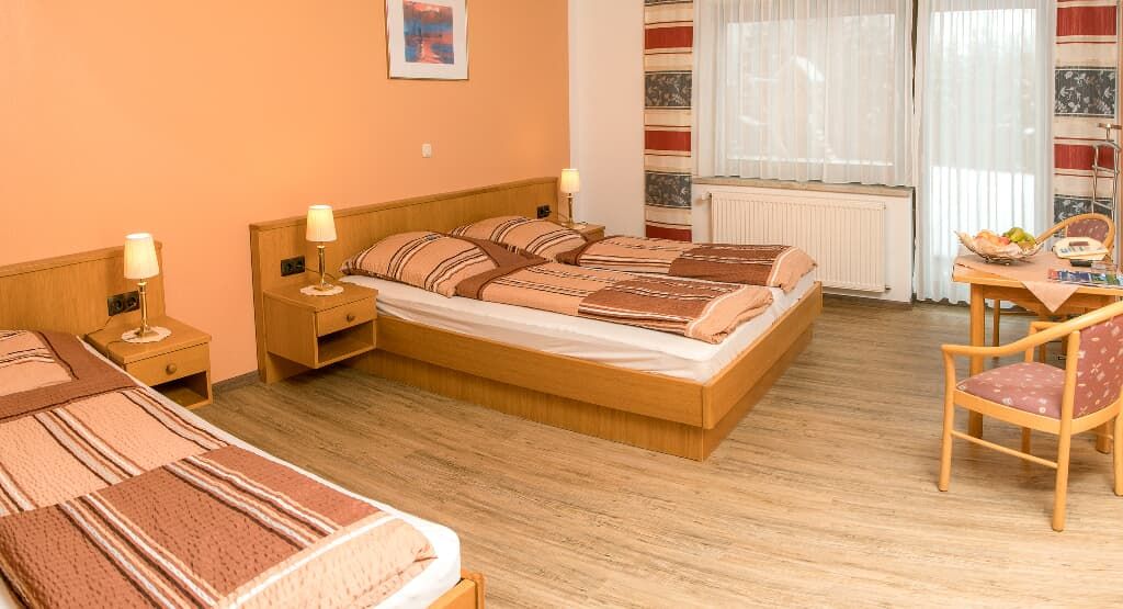 Zimmer mit Doppel- und Einzelbett, Bad mit Du/WC/Fön, SAT-TV, Telefon, WLAN, Radiowecker, Safe und Balkon oder Terrasse, weiteres Zustellbett möglich