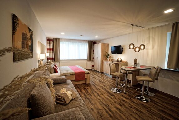 Einzimmerappartement ca. 35 m², bietet Platz für 2 - 3 Personen. Das Appartement verfügt über ein Doppelbett, Schlafcouch, Küchenzeile mit Sitzgelegenheit, sowie ein Flachbild-TV und WLAN. Bettwäsche, Fön, Handtücher sowie Kücheninventar vorhanden. Zimmerreinigung alle drei Tage, extra Reinigung auf Anfrage. Die Endreinigung ist im Preis enthalten.