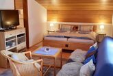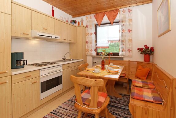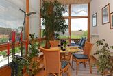 Unsere gemütliche Nichtraucher-Ferienwohnung befindet sich im 1. Obergeschoß und besteht aus Wohnküche, Wintergarten, Kinderzimmer mit Etagenbett, Wohn-Schlafzimmer und Dusche / WC. Am überdachten Balkon mit bequemen Gartenmöbeln können Sie sich vom Alltagsstress erholen. Von dort haben Sie einen Ausblick zu unserem Garten mit Teichanlage und Gartenhaus sowie in eine unverbaute Natur. Unser liebevoll angelegter Blumengarten lädt Sie zum Entspannen und Faulenzen ein (Gartenliegen sind vorhanden).