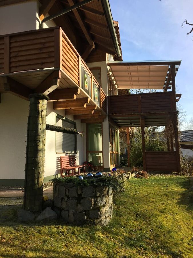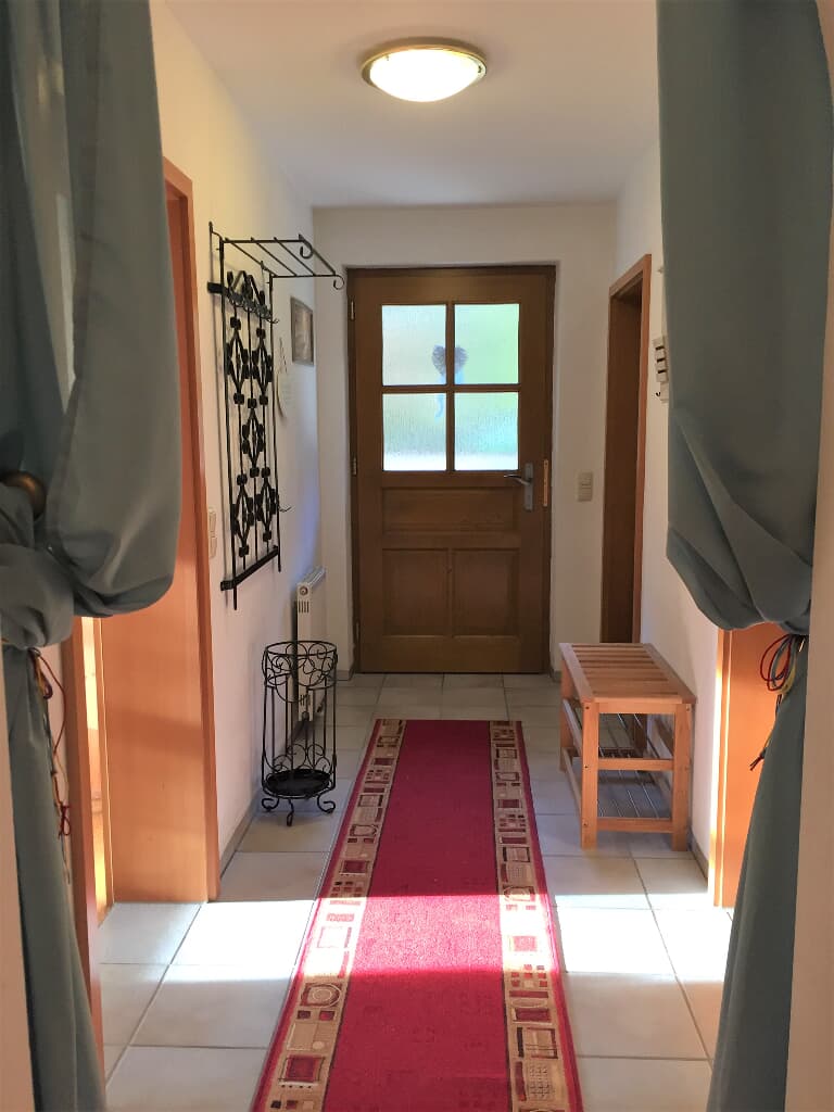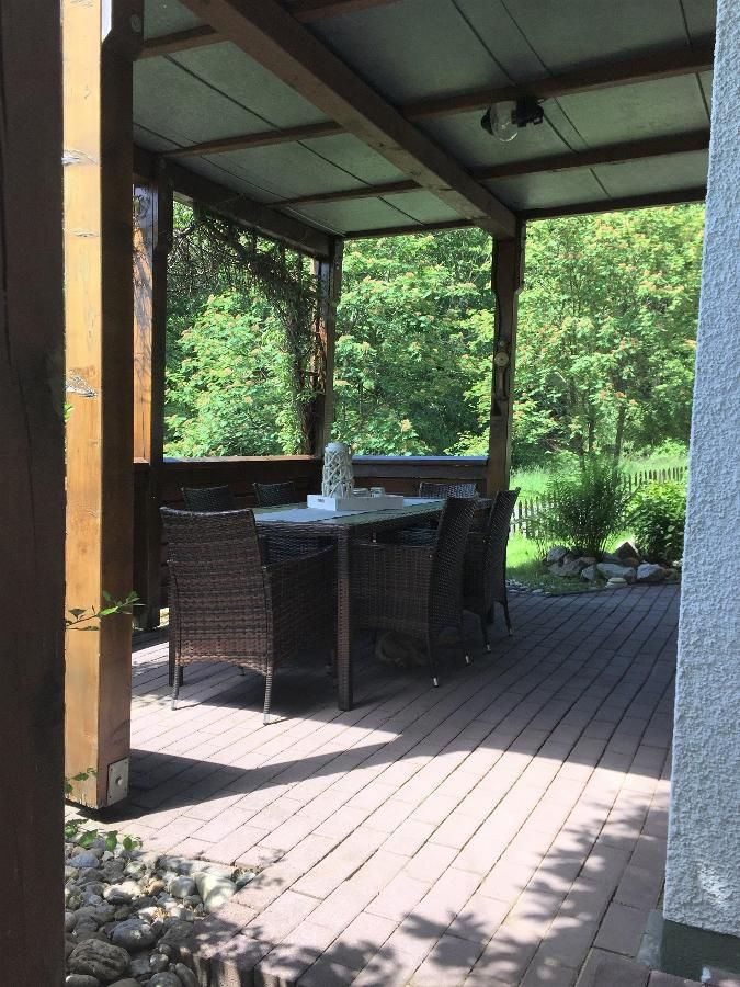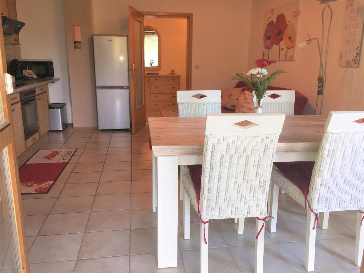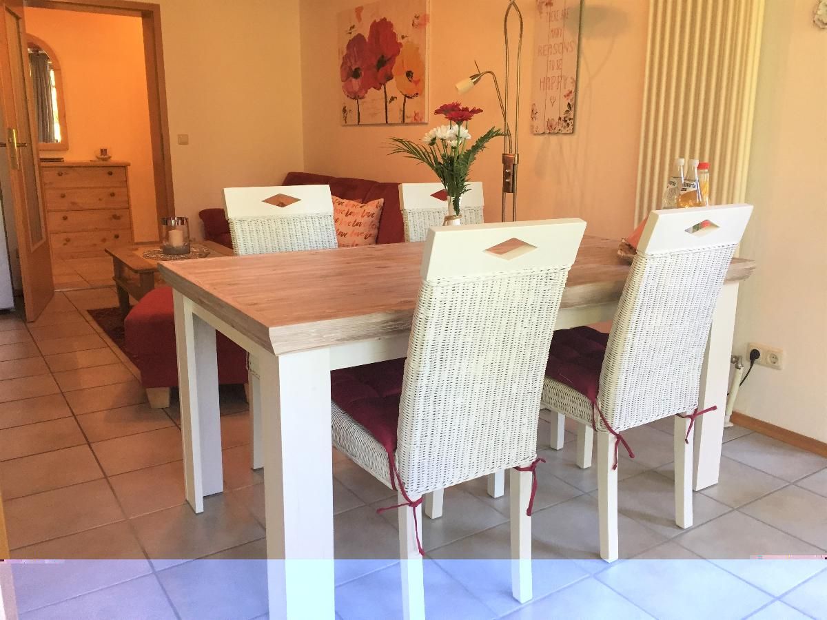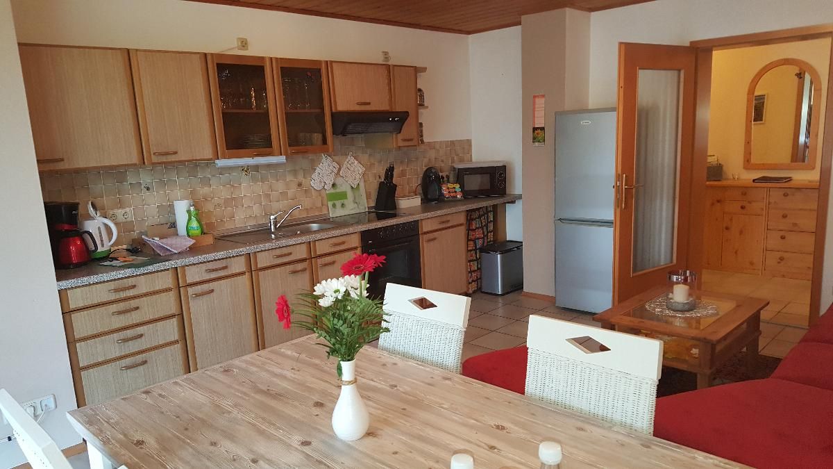 Ihnen steht eine ebenerdige, renovierte 70 qm große Ferienwohnung für bis zu 5 Personen im Erdgeschoß mit eigenem Eingang, sowie eine eigene, möbillierte und überdachte Terrasse mit Grill, Gartenliegen und privatem, kostenlosen Parkplatz zur Verfügung. Die Wohnung verfügt über ein Bad mit Dusche/WC, zwei Schlafzimmern mit je einem Doppelbett (180*200), ein weiteres Zustellbett ist möglich. In dem kombinierten Wohn/Essbereich finden Sie einen FlachTV, DVD Player und Radio. In der vollausgestatteten Küche befindet sich ein Kühlschrank mit 3 Gefrierfächern, Herd mit Backofen, eine Mikrowelle, Kaffeemaschine,Toaster, Eierkocher und Mixer. In der Gästeecke finden Sie Wanderkarten, Gesellschaftsspiele und Infomaterial. Im Preis inkl.: Handtücher und Bettwäsche, Babybett/Hochstuhl, Endreinigung, sowie eine Hygieneerstausstattung für Küche/Bad für die ersten Tage und eine Flasche Wasser. Haustiere gegen einmalige Gebühr in Höhe von 20,00 Euro.