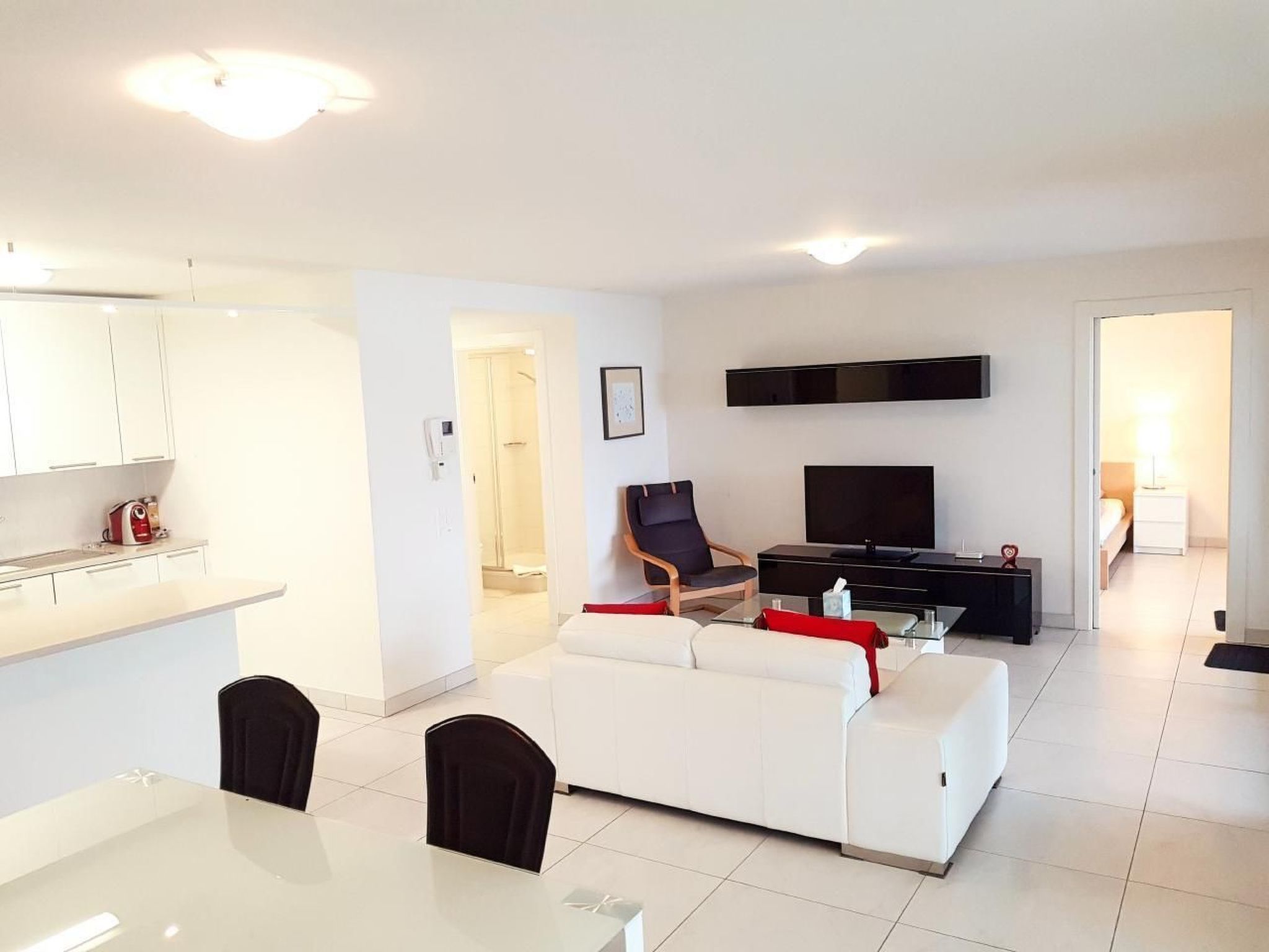 Die Wohnung befindet sich im 6. Stock der Residenza Vivian und geniesst eine aussergewöhnliche Lage und einen atemberaubenden Blick auf den Lago Maggiore. Es hat eine Fläche von 110 Quadratmetern, einschliesslich einer grossen Terrasse mit einem 180°-Blick auf den See. Es besteht aus zwei geräumigen und hellen Schlafzimmern, eines mit einem Doppelbett und eines mit zwei Einzelbetten, einem riesigen Wohnzimmer mit amerikanischer Küche, 2 Bädern, eines mit Badewanne und Bidet und eines mit Dusche. Ein Privatparkplatz innerhalb des Gebäudes ist im Preis der Wohnung inbegriffen.   Die Residenza Vivian ist ein Gebäude in Alleineigentümerschaft, das vor kurzem mit vollem Respekt für die Umwelt und nach modernen ökologischen Standards unter Verwendung von natürlichen und hochwertigen Materialien wie Granit, Marmor und Glas gebaut wurde. Geheizt und gekühlt wird mit geothermischer Energie, dank des Seewassers, ganz ohne Öl oder Gas. Die Apartments sind geräumig, hell, mit allen Annehmlichkeiten ausgerüstet und stilvoll eingerichtet. Sie sind komplett ausgestattet mit Waschmaschine, Trockner, Wäsche, Geschirr und sämtlichen Küchenutensilien (einschliesslich Wasserkocher, Nespresso-Kaffeemaschine und Mikrowelle).   Die Lage der Residenza ist einzigartig: Sie ist optimal an die öffentlichen Verkehrsmittel angeknüpft und nur 5 Gehminuten vom Bahnhof, dem Stadtzentrum, allen Dienstleistungen und den wichtigsten Touristenattraktionen der Stadt entfernt. Zum Beispiel: die Altstadt, der Hafen, das Kursaal Casino, Lido di Locarno und sein SPA Termali e Salini, Tennis, Golf, Krankenhaus, Restaurants, Märkte und Supermärkte, Seilbahn nach Cardada und Madonna del Sasso, Wälder Wander- und Fahrradwege, Strände, .... Es ist nur wenige Autominuten von Ascona entfernt und die Kreuzung zu den üppigen Tälern der Region Locarno, die sich durch ihr vielfältiges Angebot an Sommer-, Winter- und Bergsportarten und durch die intakte Erhaltung alter Traditionen auszeichnet.   Sportmöglichkeiten in der Umgebung: Bergsteigen, Eislaufen, Golfplatz, Jagdmöglichkeit, Kanu, Klettern, Mountainbiking, Radtouren, Rafting, Reithalle, Reitplatz / Reitmöglichkeiten, Rodeln, Rudern, Ski (alpin), Sportcenter, Squash, Surfen, Tauchen, Tennis, Wasserski, Segeln Basisinformationen - Erlaubte Haustiere: keins - Unterkunftstyp: Ferienwohnung - keine Einsicht von der Straße - Nichtraucherunterkunft - Schlafzimmeranzahl: 2 - Badezimmeranzahl: 2 Top Merkmale - WLAN - Klimaanlage: teilweise - Heizung: teilweise - Fußbodenheizung: überall - Terrasse - Private PKW-Stellplätze insgesamt für diese Unterkunft: 2 - ㄴ davon Garagenstellplätze: 1 - ㄴ davon private Außen­stellplätze: 1 Schlafen im Wohnbereich - Schlafzimmer abdunkelbar Schlafzimmer 1 - Doppelbett (1,80m Breite) - Schlafzimmer abdunkelbar Schlafzimmer 5 - 2x Einzelbett - Schlafzimmer abdunkelbar Badezimmer Badezimmer 1 - Dusche - Waschbecken - Föhn Badezimmer 5 - Badewanne mit Duschvorrichtung - Badewanne - Waschbecken - Bidet - Föhn Kochen/Wohnen - Kaffeemaschine: Espressokanne, Kaffeemaschine - Kühl-/Gefrierschrank: Gefrierfach, Tiefkühlschrank, Kühlschrank - Herd: Elektroherd, Herd - Dunstabzugshaube - Backofen - Toaster - Mikrowelle - Wasserkocher - Spülmaschine - Anzahl Esstische: 1 - Gesamtzahl Sitzplätze: 4 - Anzahl Wohnzimmer: 1 Entertainment - Fernseher: TV, Kabel-TV, Sat.-TV Hauswirtschaft - Waschmaschine: zur gemeinschaftlichen Nutzung im Gebäude - Wäschetrockner: zur alleinigen Nutzung im Objekt - Staubsauger Barrierefreiheit - Aufzug Umgebung - Aussicht: Berg, Garten, Wald, Wiese, See, Tal - nächstgelegene Ortsmitte: 1,0 km - Lebensmittelhandel: 200 m - Cafés/Restaurants: 200 m - Bahnhof: 650 m - Flughafen: 60,0 km - Autobahn: 10,0 km - See: 1 m - Fahrrad-Verleih: 1 m - Berg-/Seilbahn: 1,0 km Besonderheiten - Inmitten der Natur gelegen
