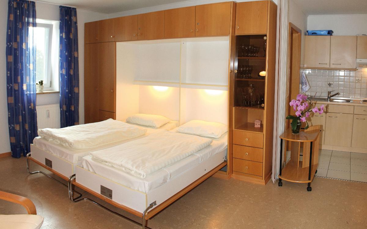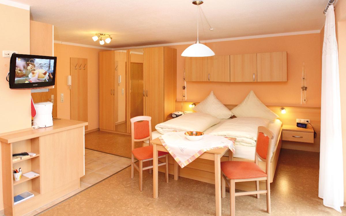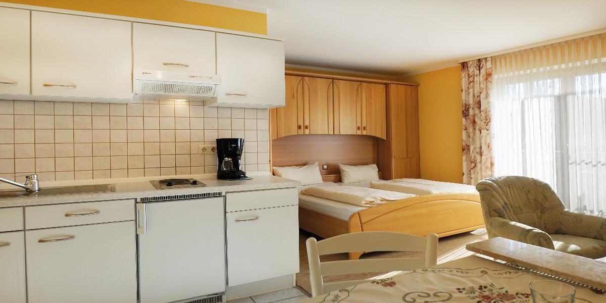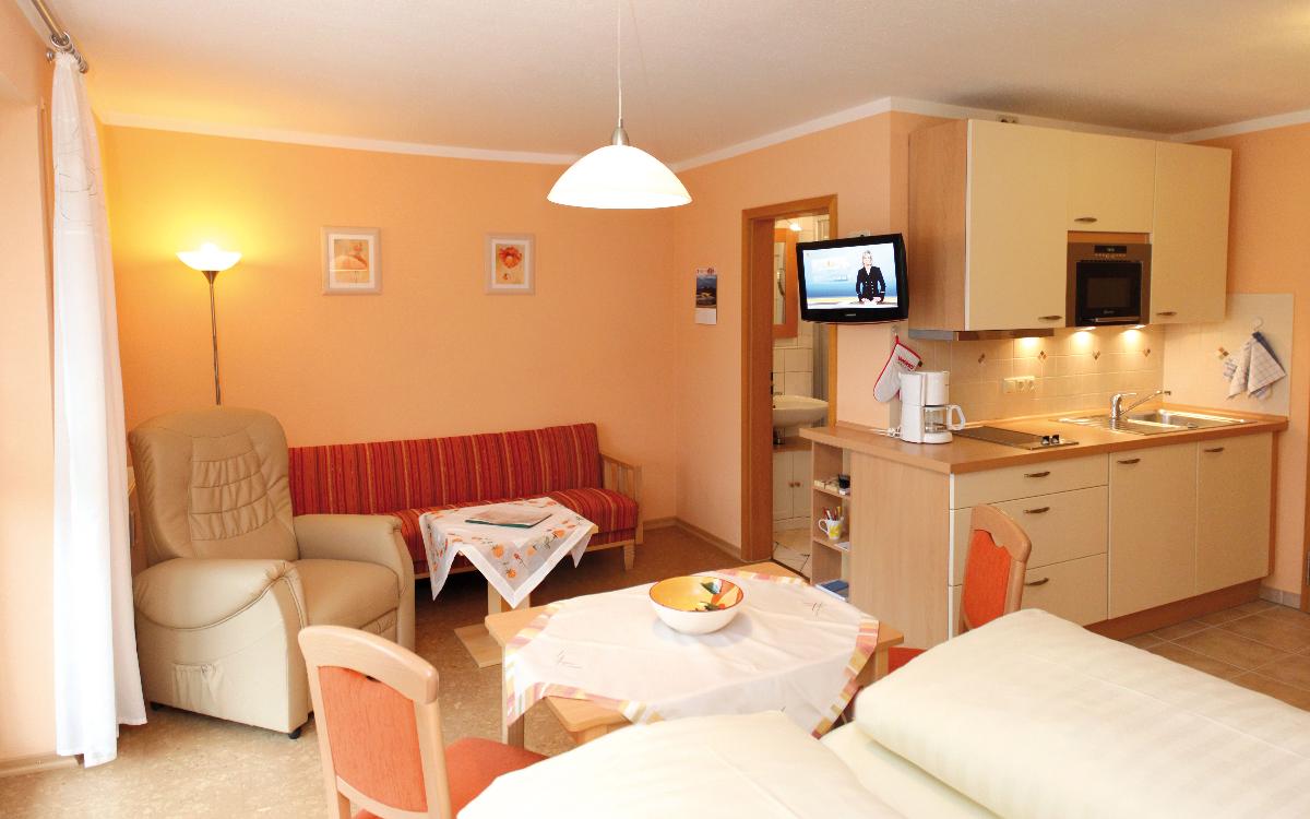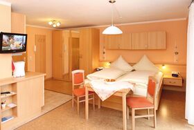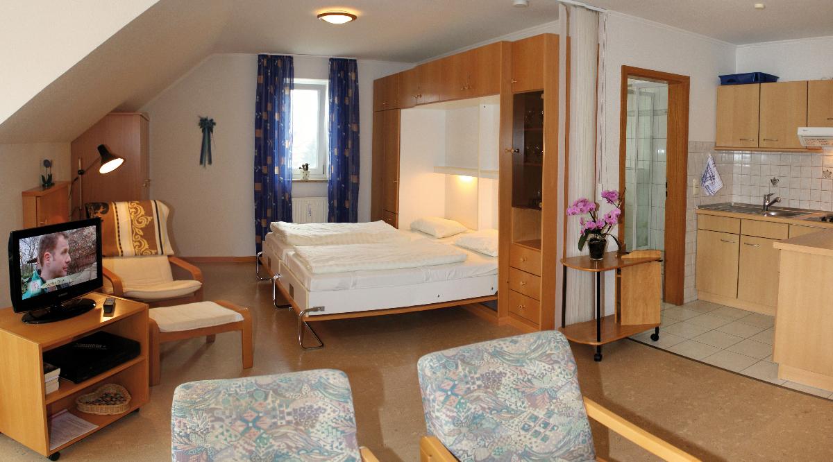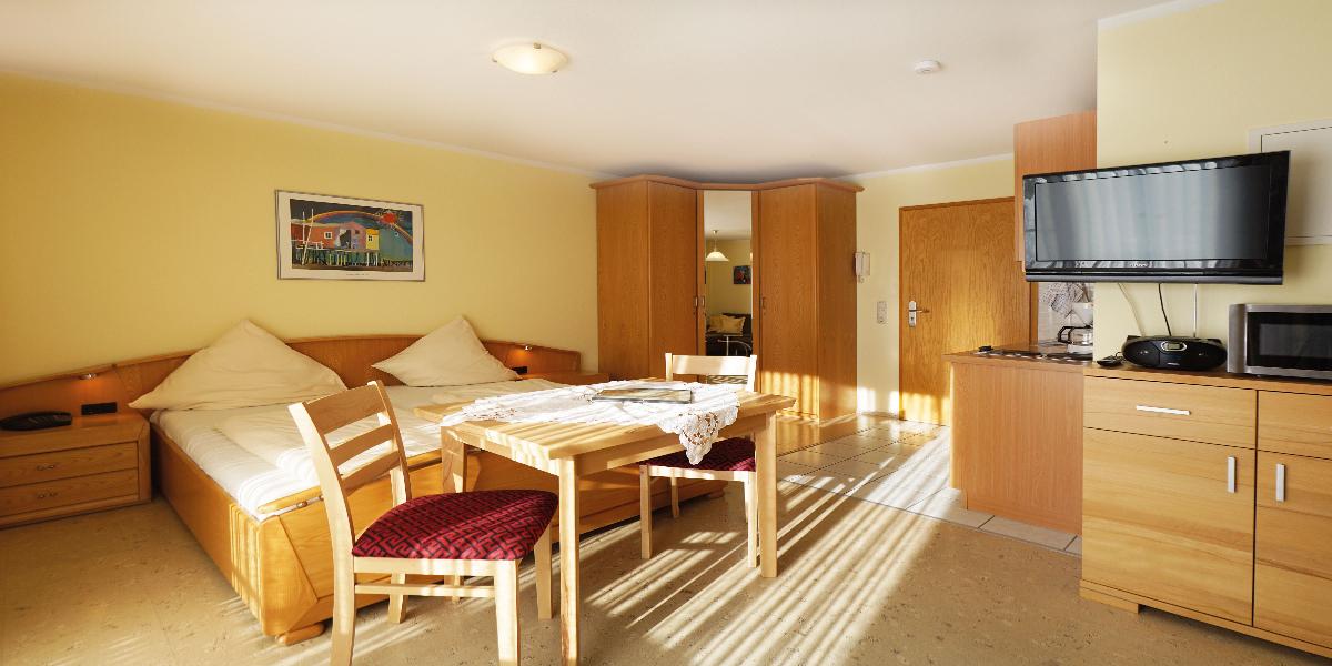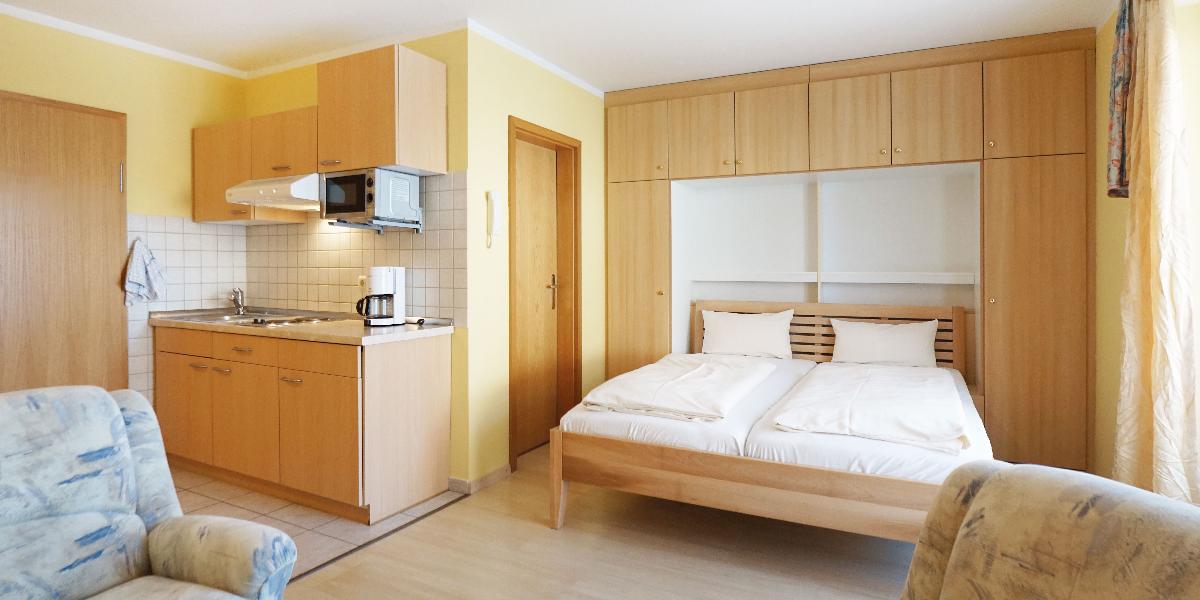 Die geräumigen 1-Zimmer-Appartement Typ A (ca. 30-34 qm) sind für 2 Personen ausgelegt. Im kombinierten Wohn- und Schlafzimmer befindet sich ein bequemes Doppelbett, ein Esstisch sowie eine voll ausgestattete Küche, Radio, SAT-TV, Couch und ein kleiner Couchtisch. Die Küche ist mit einem 2-Platten-Kochfeld, Mikrowelle, Kaffeemaschine, Spüle und Geschirr ausgestattet. Das Bad besteht aus Dusche und WC. Auf dem schönen Balkon/ Terrasse können Sie die Sonne und Aussicht genießen. Balkonmöbel sind vorhanden.