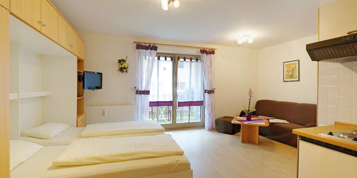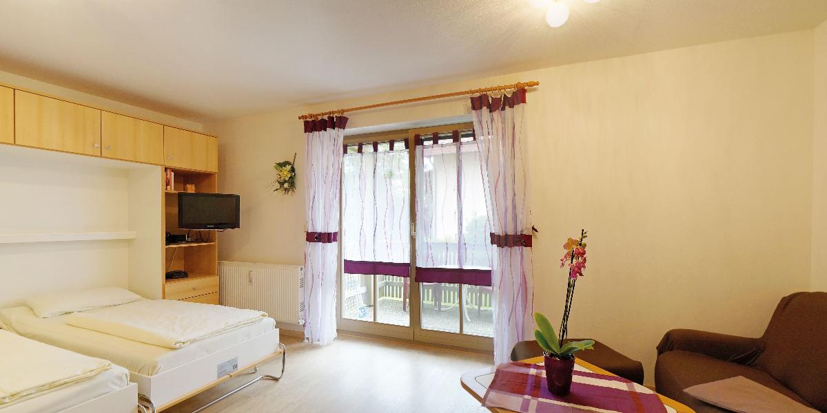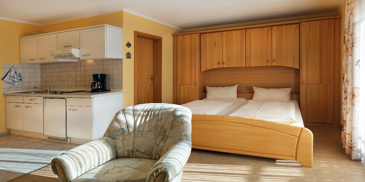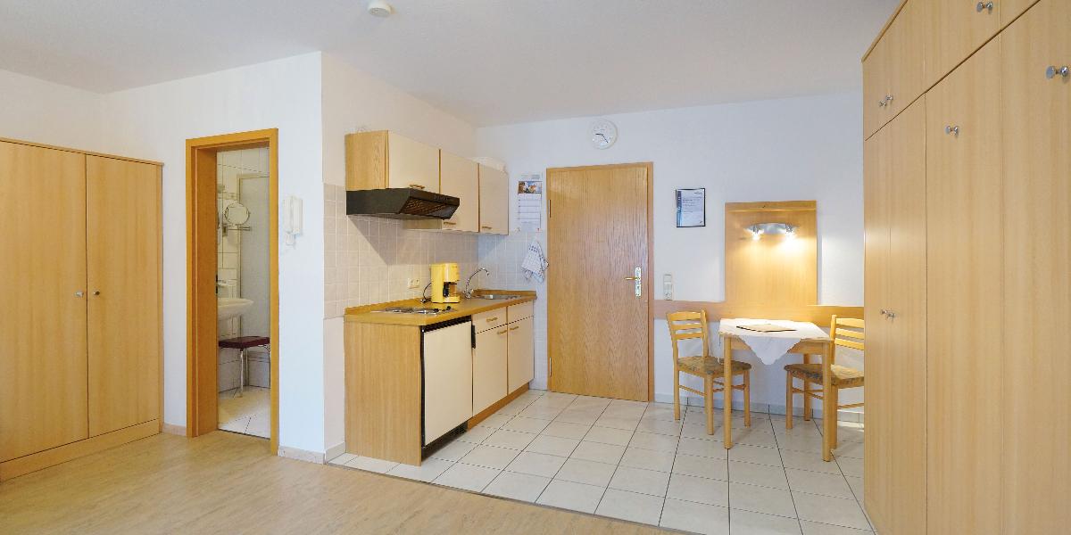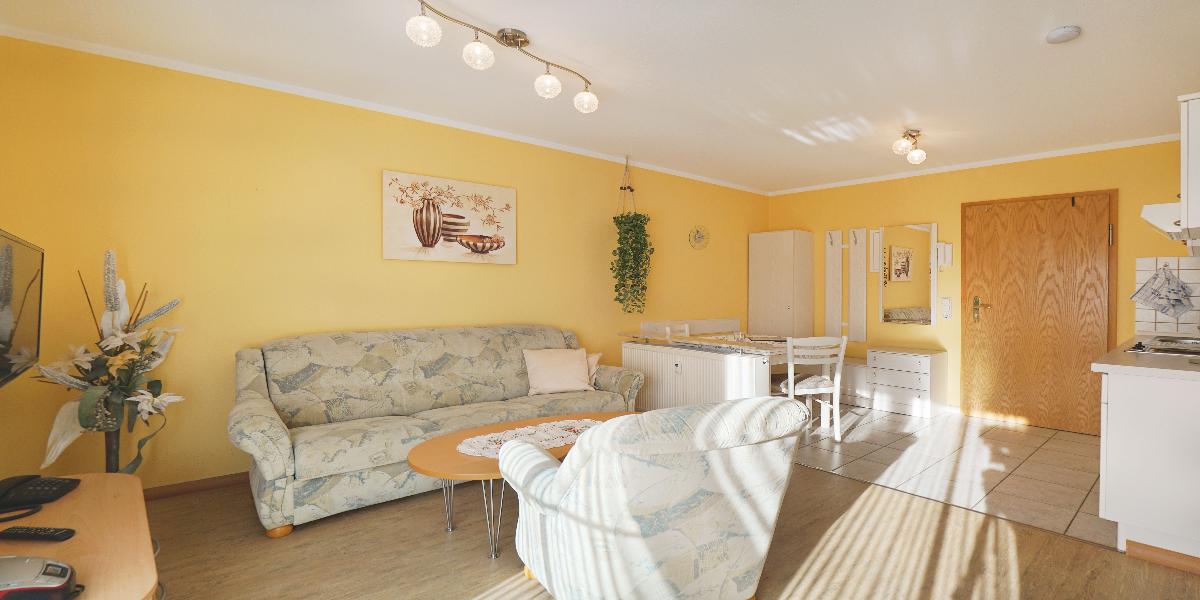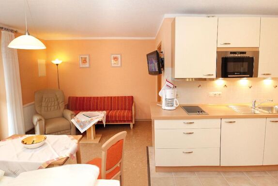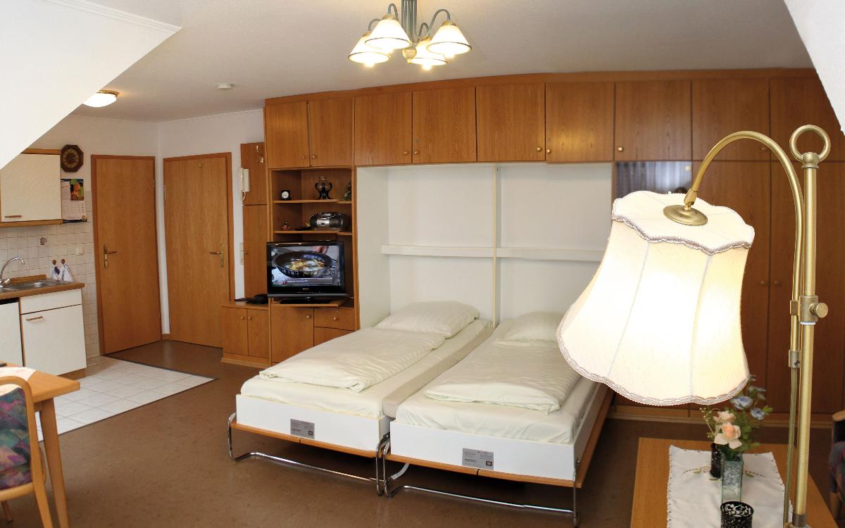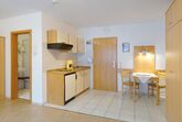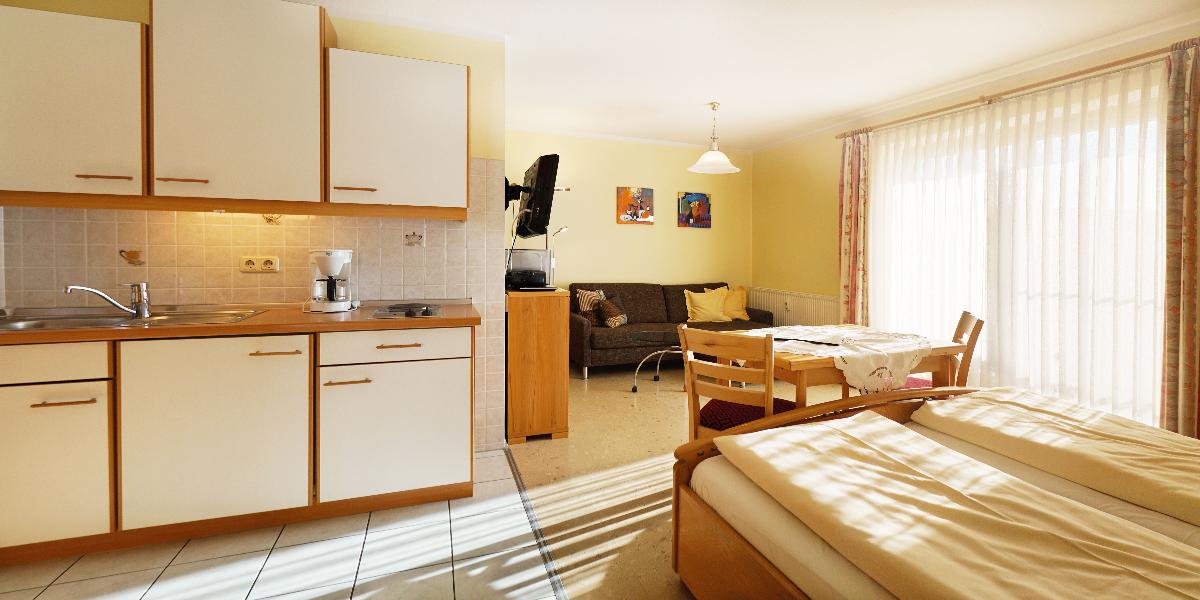 Die geräumigen 1-Zimmer-Appartement Typ A (ca. 30-34 qm) sind für 2 Personen ausgelegt. Im kombinierten Wohn- und Schlafzimmer befindet sich ein bequemes Doppelbett, ein Esstisch sowie eine voll ausgestattete Küche, Radio, SAT-TV, Couch und ein kleiner Couchtisch. Die Küche ist mit einem 2-Platten-Kochfeld, Mikrowelle, Kaffeemaschine, Spüle und Geschirr ausgestattet. Das Bad besteht aus Dusche und WC. Auf dem schönen Balkon/ Terrasse können Sie die Sonne und Aussicht genießen. Balkonmöbel sind vorhanden.