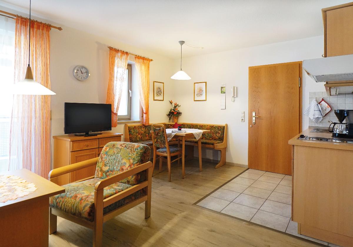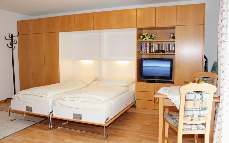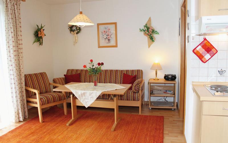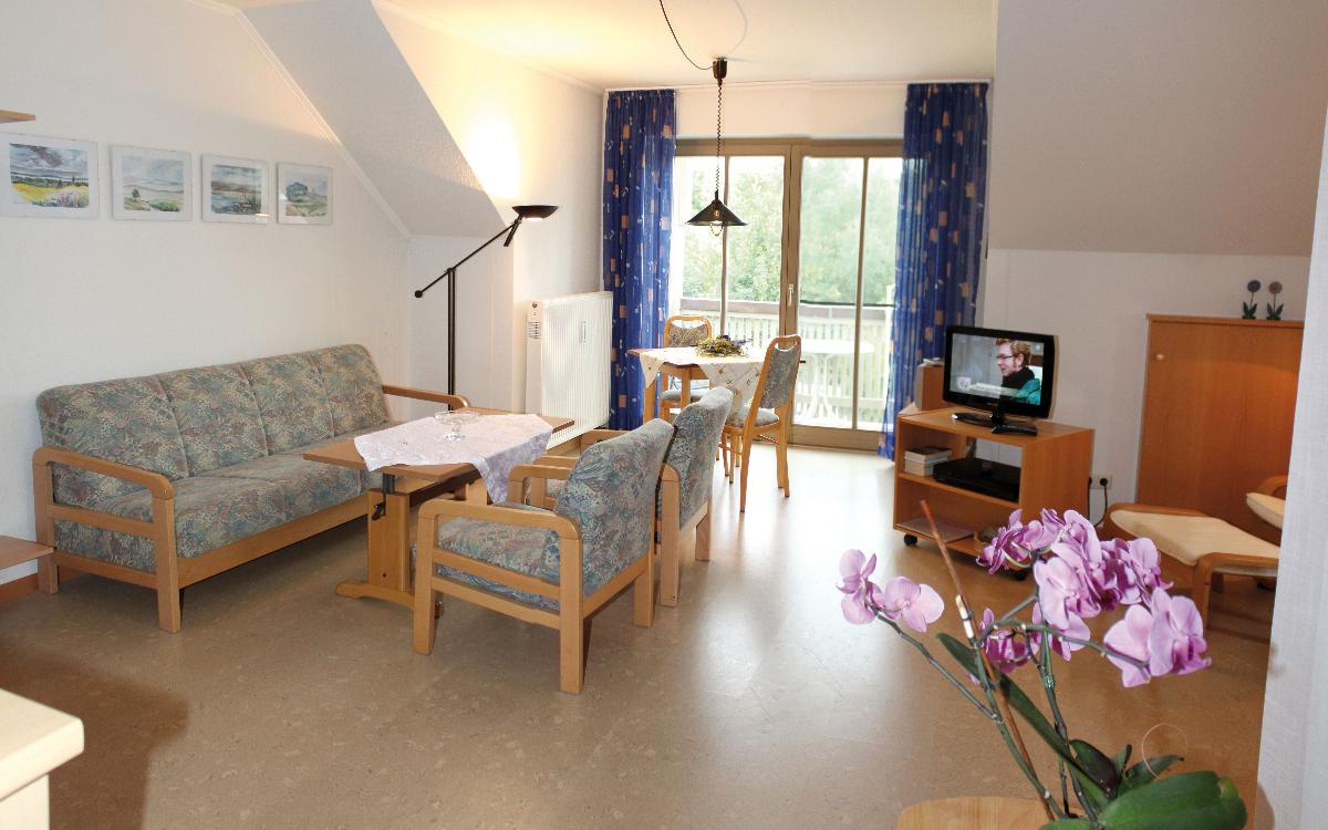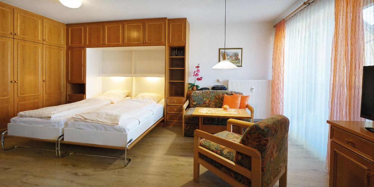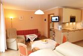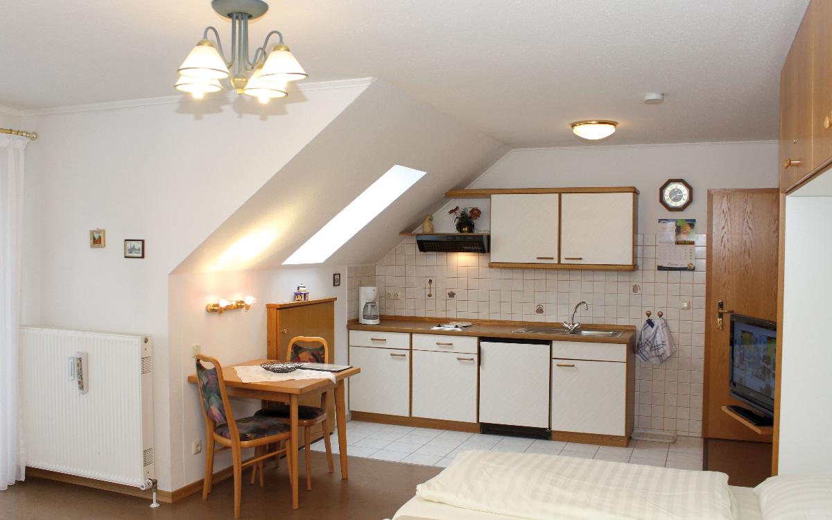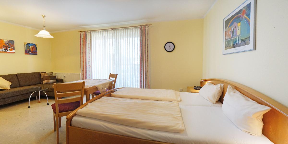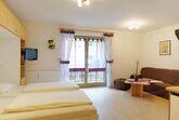 Die geräumigen 1-Zimmer-Appartement Typ A (ca. 30-34 qm) sind für 2 Personen ausgelegt. Im kombinierten Wohn- und Schlafzimmer befindet sich ein bequemes Doppelbett, ein Esstisch sowie eine voll ausgestattete Küche, Radio, SAT-TV, Couch und ein kleiner Couchtisch. Die Küche ist mit einem 2-Platten-Kochfeld, Mikrowelle, Kaffeemaschine, Spüle und Geschirr ausgestattet. Das Bad besteht aus Dusche und WC. Auf dem schönen Balkon/ Terrasse können Sie die Sonne und Aussicht genießen. Balkonmöbel sind vorhanden.