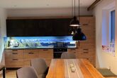 Unsere neue Ferienwohnung ist ca. 75 m² groß und mit Naturholz ausgestattet. Sie besitzt eine große Wohnküche, 2 geräumige Schlafzimmer, ein Badezimmer, ein WC, ein Kellerabteil für Schiablage, Carport u. eine Sonnenterrasse. Die Unterkunft liegt im 2 Stock u. ist bequem mit dem Lift zu erreichen. Die Küche lässt keine Wünsche offen. Vom Geschirrspüler über Backofen, Mikro, Toaster, Kühlschrank ist alles vorhanden. Koch u. Eßgeschirr für 6 Personen ist da. 2 Schlafzimmer sind mit 180x200 cm großen Boxspringbetten ausgestattet u. sorgen für guten Schlaf. Die Couch im Wohnzimmer kann zu einem Doppelbett ausgezogen werden. Im Badezimmer ist genügend Platz für zwei Waschbecken.